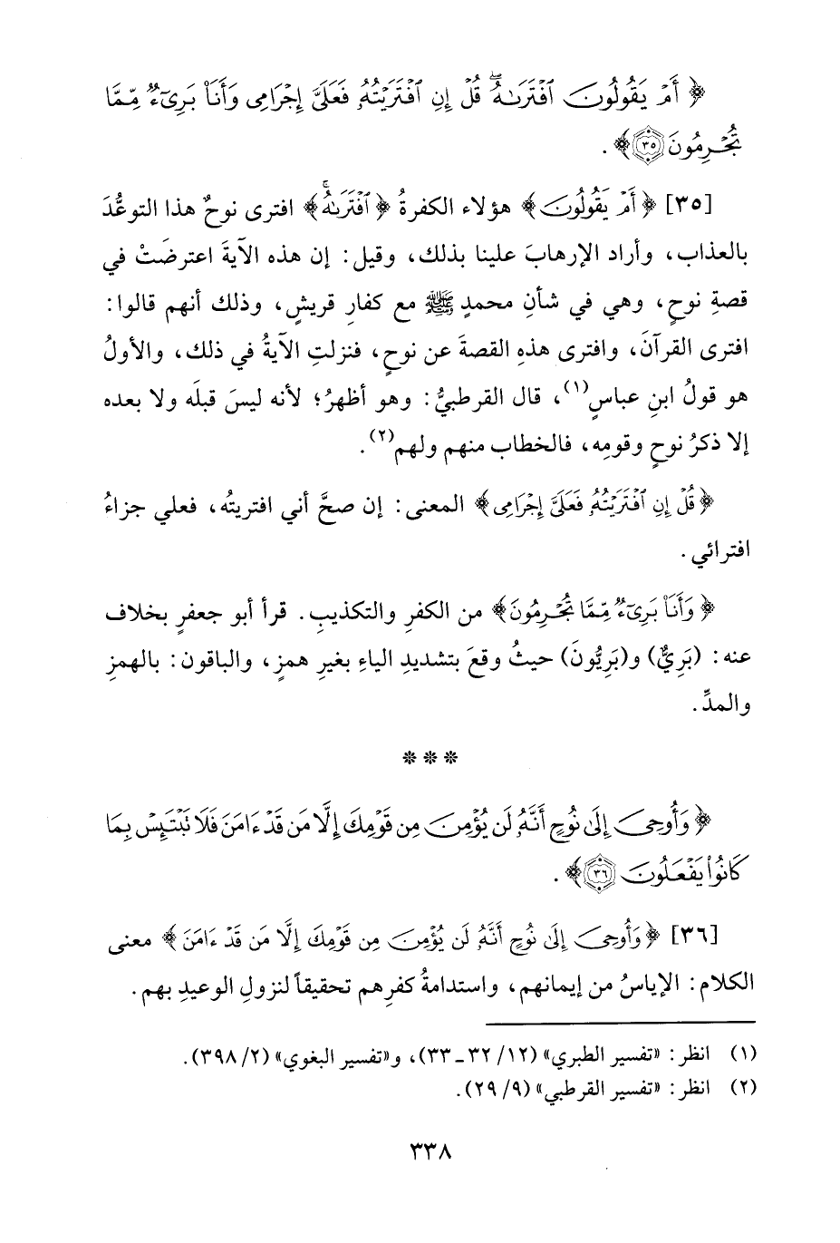 [35] {أَمْ يَقُولُونَ} هؤلاء الكفرةُ {افْتَرَاهُ} افترى نوحٌ هذا التوعُّدَ بالعذاب، وأراد الإرهابَ علينا بذلك، وقيل: إن هذه الآيةَ اعترضَتْ في قصةِ نوحِ، وهي في شأنِ محمدٍ - صلى الله عليه وسلم - مع كفارِ قريشٍ، وذلك أنهم قالوا: افترى القرآنَ، وافترى هذهِ القصةَ عن نوحٍ، فنزلتِ الآيةُ في ذلك، والأولُ هو قولُ ابنِ عباسٍ (¬1)، قال القرطبيُّ: وهو أظهرُ؛ لأنه ليسَ قبلَه ولا بعده إلا ذكرُ نوحٍ وقومِه، فالخطاب منهم ولهم (¬2).