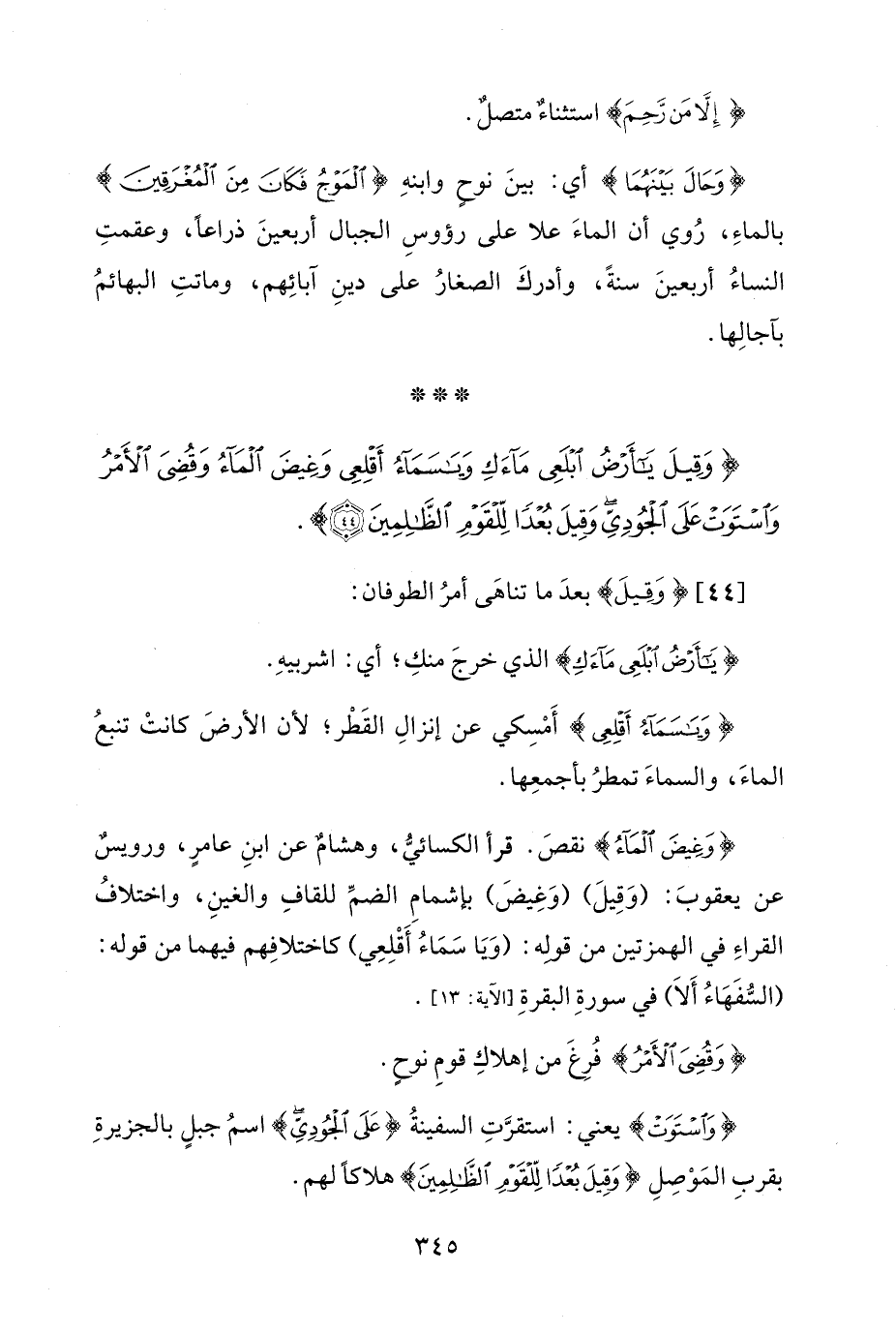 {وَقِيلَ يَاأَرْضُ ابْلَعِي مَاءَكِ وَيَاسَمَاءُ أَقْلِعِي وَغِيضَ الْمَاءُ وَقُضِيَ الْأَمْرُ وَاسْتَوَتْ عَلَى الْجُودِيِّ وَقِيلَ بُعْدًا لِلْقَوْمِ الظَّالِمِينَ (44)}.