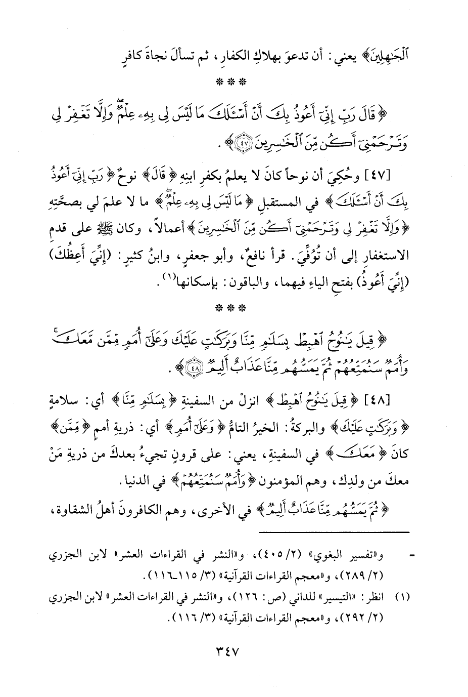 [47] وحُكِيَ أن نوحًا كانَ لا يعلمُ بكفرِ ابنِهِ {قَالَ} نوحٌ {رَبِّ إِنِّي أَعُوذُ بِكَ أَنْ أَسْأَلَكَ} في المستقبلِ {مَا لَيْسَ لِي بِهِ عِلْمٌ} ما لا علمَ لي بصحَّتِهِ {وَإِلَّا تَغْفِرْ لِي وَتَرْحَمْنِي أَكُنْ مِنَ الْخَاسِرِينَ} أعمالًا، وكان - صلى الله عليه وسلم - على قدمِ الاستغفارِ إلى أن تُوُفِّيَ. قرأ نافعٌ، وأبو جعفرٍ، وابنُ كثيرٍ: (إِنِّيَ أَعِظُكَ) (إِنِّيَ أَعُوذُ) بفتحِ الياءِ فيهما، والباقون: بإسكانها (¬1).