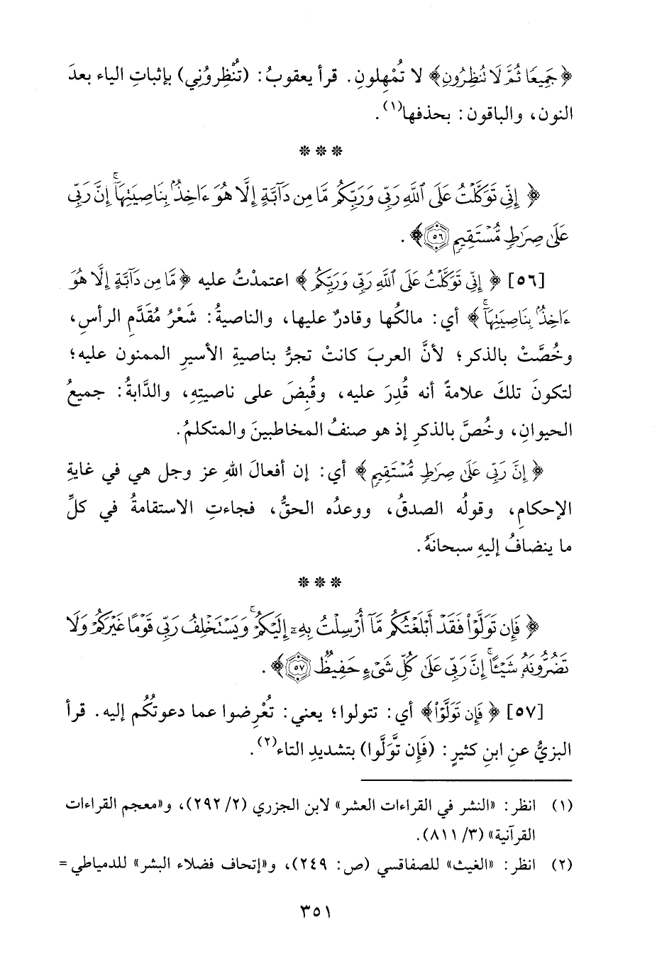 [57] {فَإِنْ تَوَلَّوْا} أي: تتولوا؛ يعني: تُعْرِضوا عما دعوتُكُم إليه. قرأ البزيُّ عنِ ابنِ كثيرٍ: (فَإِن تَّوَلَّوا) بتشديدِ التاء (¬2).