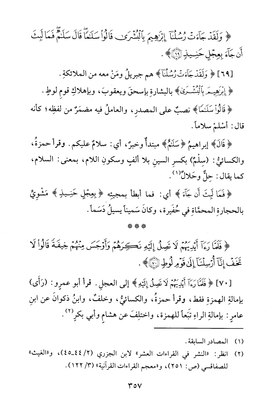 [70] {فَلَمَّا رَأَى أَيْدِيَهُمْ لَا تَصِلُ إِلَيْهِ} إلى العجلِ. قرأ أبو عمرٍو: (رَأَى) بإمالةِ الهمزةِ فقط، وقرأ حمزةُ، والكسائيُّ، وخلفٌ، وابنُ ذكوانَ عن ابنِ عامرٍ: بإمالةِ الراءِ تبًعًا للهمزة، واختلِفَ عن هشامٍ وأبي بكرٍ (¬2).