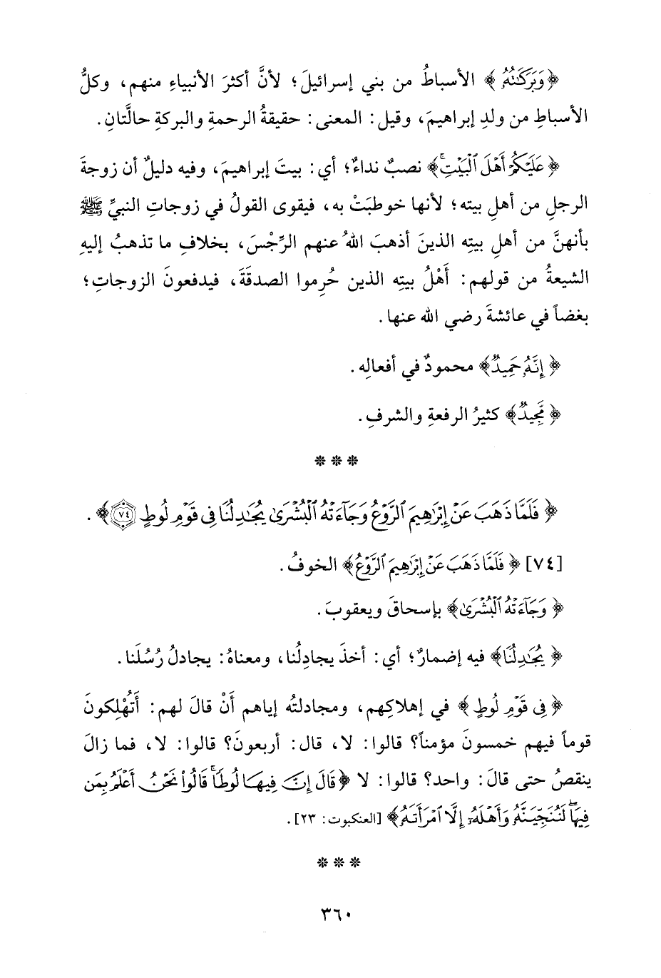 {عَلَيْكُمْ أَهْلَ الْبَيْتِ} نصبٌ نداءٌ؛ أي: بيتَ إبراهيمَ، وفيه دليلٌ أن زوجةَ الرجلِ من أهلِ بيته؛ لأنها خوطبَتْ به، فيقوى القولُ في زوجاتِ النبيِّ - صلى الله عليه وسلم - بأنهن من أهلِ بيتِه الذينَ أذهبَ اللهُ عنهم الرَجْسَ، بخلافِ ما تذهبُ إليهِ الشيعةُ من قولهم: أَهْلُ بيتِه الذين حُرِموا الصدقَةَ، فيدفعونَ الزوجاتِ؛ بغضًا في عائشةَ رضي الله عنها.