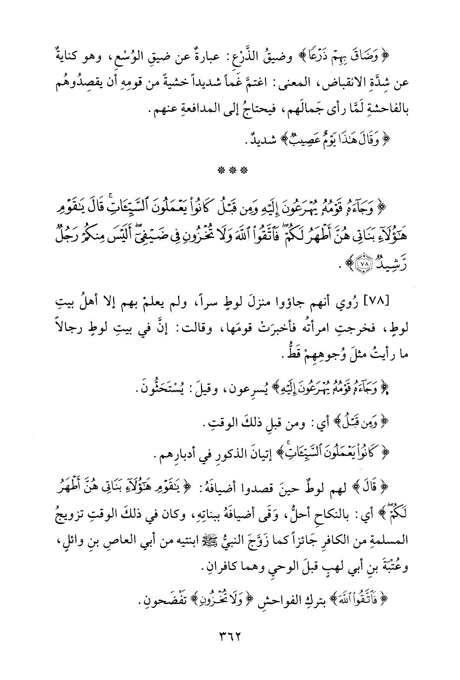 {وَجَاءَهُ قَوْمُهُ يُهْرَعُونَ إِلَيْهِ وَمِنْ قَبْلُ كَانُوا يَعْمَلُونَ السَّيِّئَاتِ قَالَ يَاقَوْمِ هَؤُلَاءِ بَنَاتِي هُنَّ أَطْهَرُ لَكُمْ فَاتَّقُوا اللَّهَ وَلَا تُخْزُونِ فِي ضَيْفِي أَلَيْسَ مِنْكُمْ رَجُلٌ رَشِيدٌ (78)}.