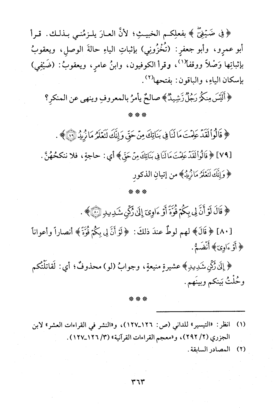 {فِي ضَيْفِي} بفعلِكم الخبيثِ؛ لأنَّ العارَ يلزمُني بذلك. قرأ أبو عمرٍو، وأبو جعفرٍ: (تُخْزُوني) بإثباتِ الياءِ حالةَ الوصلِ، ويعقوبُ بإثباتِها وَصْلًا ووقفًا (¬1)، وقرأ الكوفيون، وابنُ عامرٍ، ويعقوبُ: (ضَيْفِي) بإسكان الياءِ، والباقون: بفتحها (¬2).