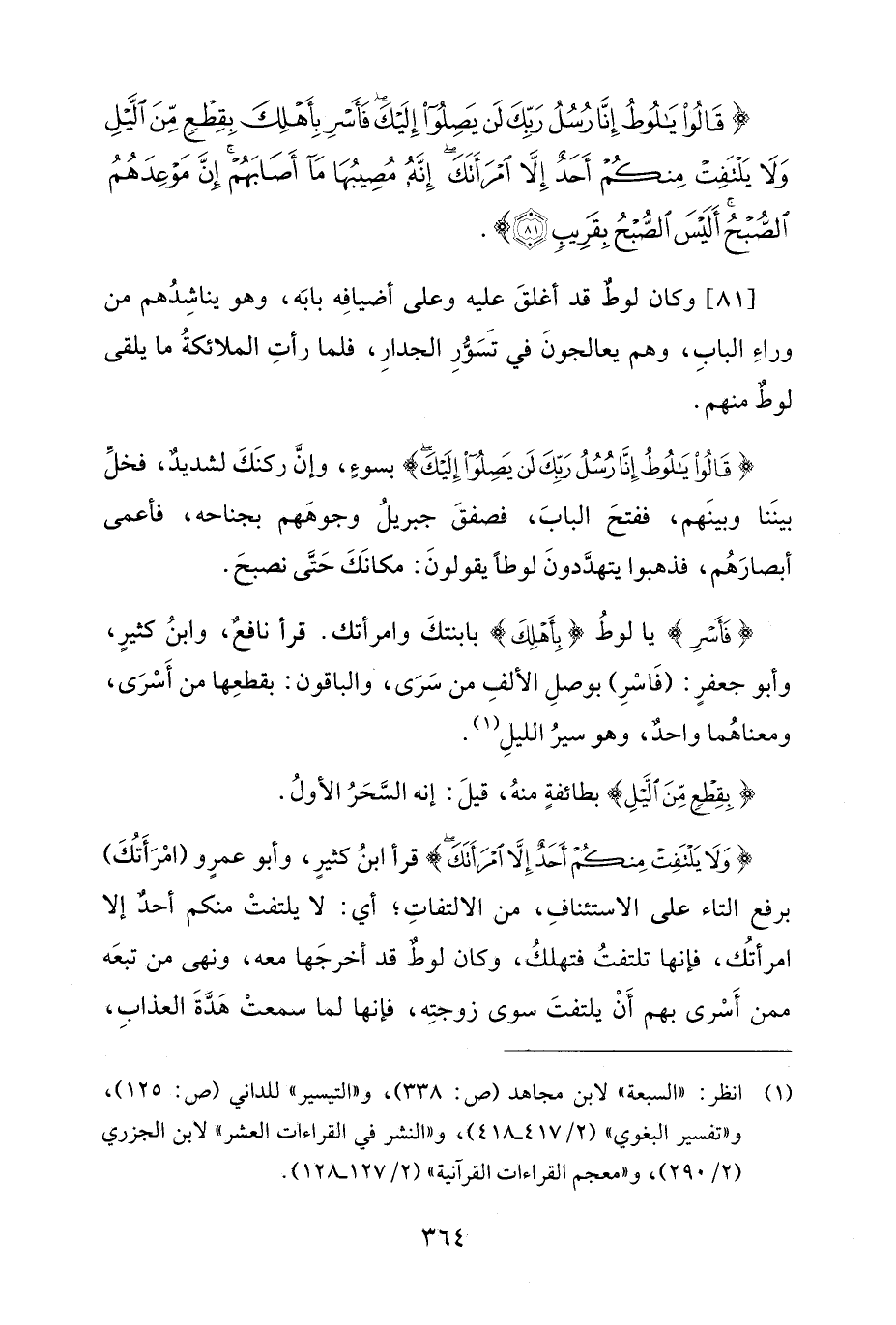 {فَأَسْرِ} يا لوطُ {بِأَهْلِكَ} بابنتكَ وامرأتك. قرأ نافعٌ، وابنُ كثيرٍ، وأبو جعفرٍ: (فَاسْرِ) بوصلِ الألفِ من سَرَى، والباقون: بقطعِها من أَسْرَى، ومعناهُما واحدٌ، وهو سيرُ الليلِ (¬1).