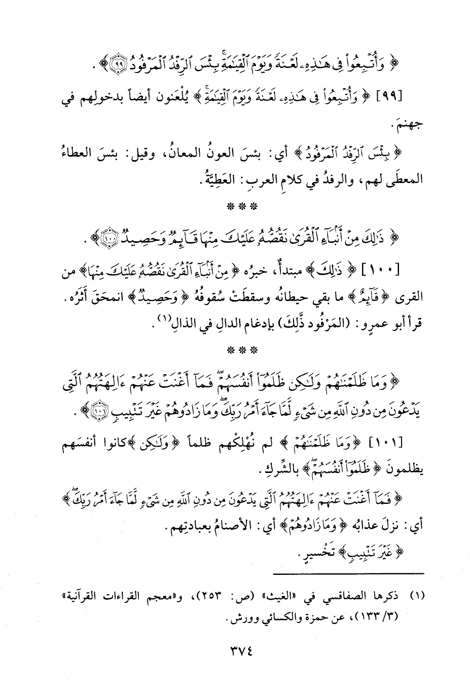 [100] {ذَلِكَ} مبتدأٌ، خبرُه {مِنْ أَنْبَاءِ الْقُرَى نَقُصُّهُ عَلَيْكَ مِنْهَا} من القرى {قَائِمٌ} ما بقي حيطانُه وسقطَتْ سُقوفُهُ {وَحَصِيدٌ} انمحَقَ أَثَرُه. قرأ أبو عمرٍو: (المَرْفُود ذلِكَ) بإدغام الدالِ في الذالِ (¬1).