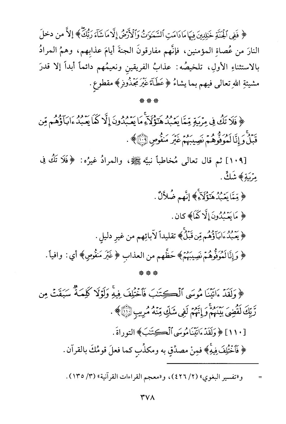 {فَلَا تَكُ فِي مِرْيَةٍ مِمَّا يَعْبُدُ هَؤُلَاءِ مَا يَعْبُدُونَ إِلَّا كَمَا يَعْبُدُ آبَاؤُهُمْ مِنْ قَبْلُ وَإِنَّا لَمُوَفُّوهُمْ نَصِيبَهُمْ غَيْرَ مَنْقُوصٍ (109)}.