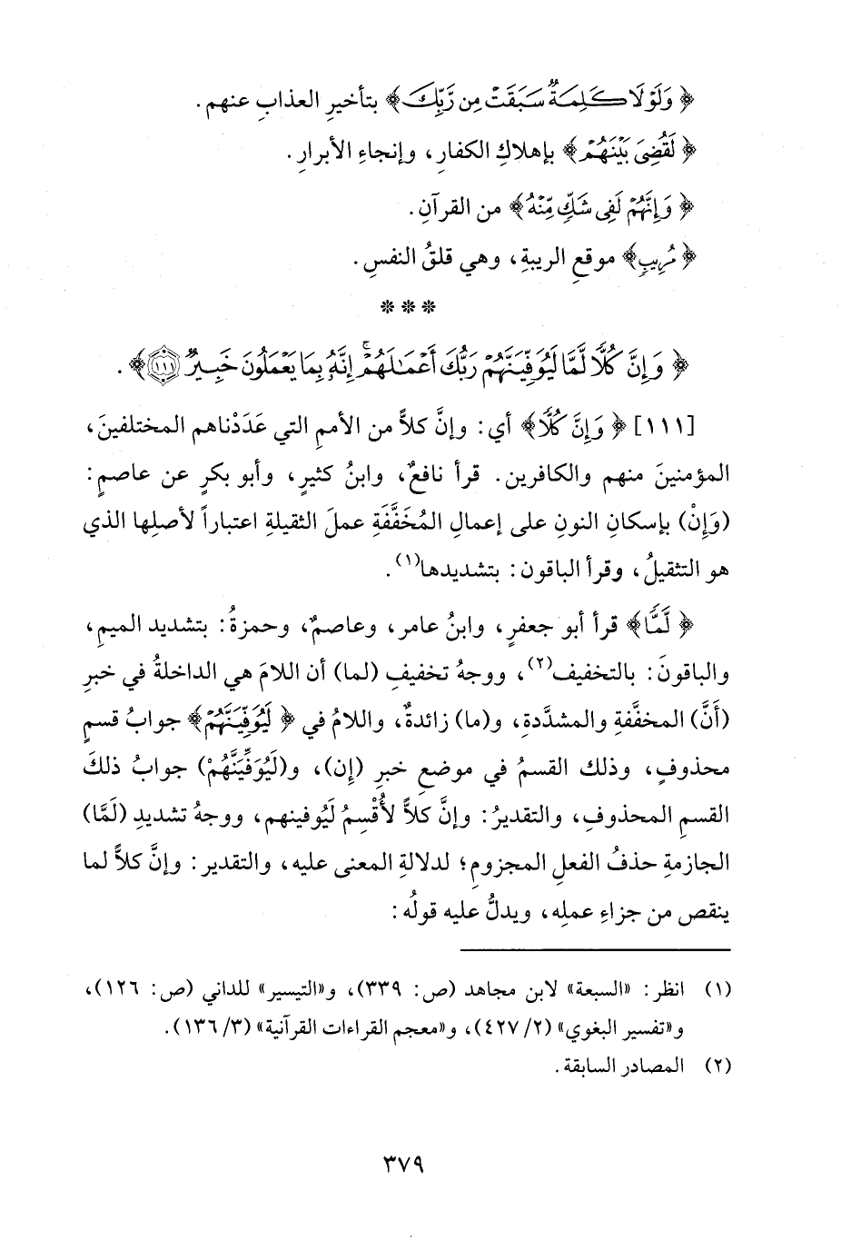 [111] {وَإِنَّ كُلًّا} أي: وإنَّ كلًّا من الأممِ التي عَدَدْناهم المختلفينَ، المؤمنينَ منهم والكافرين. قرأ نافعٌ، وابنُ كثيرٍ، وأبو بكرٍ عن عاصمٍ: (وَإِنْ) بإسكانِ النونِ على إعمالِ المُخَفَّفَةِ عملَ الثقيلةِ اعتبارًا لأصلِها الذي هو التثقيلُ، وقرأ الباقون: بتشديدها (¬1).