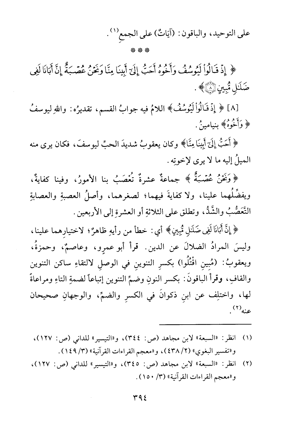 {إِذْ قَالُوا لَيُوسُفُ وَأَخُوهُ أَحَبُّ إِلَى أَبِينَا مِنَّا وَنَحْنُ عُصْبَةٌ إِنَّ أَبَانَا لَفِي ضَلَالٍ مُبِينٍ (8)} [يوسف: 8].
