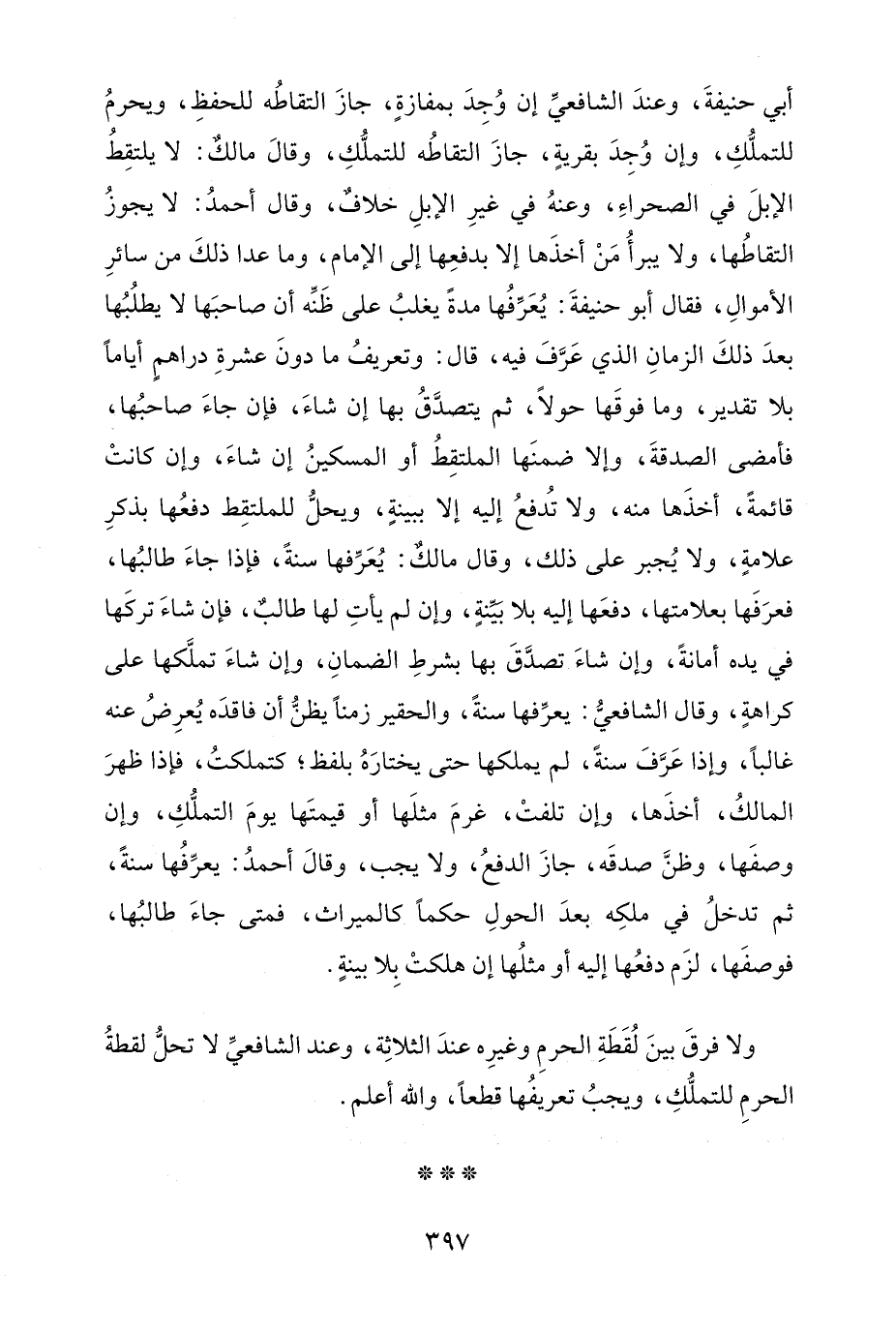 أبي حنيفةَ، وعندَ الشافعيِّ إن وُجِدَ بمفازةٍ، جازَ التقاطُه للحفظِ، ويحرمُ للتملُّكِ، وإن وُجِدَ بقريةٍ، جازَ التقاطُه للتملُّكِ، وقالَ مالكٍ: لا يلتقِطُ الإبلَ في الصحراءِ، وعنهُ في غيرِ الإبلِ خلافٌ، وقال أحمدُ: لا يجوزُ التقاطُها، ولا يبرأُ مَنْ أخذَها إلا بدفعِها إلى الإمام، وما عدا ذلكَ من سائرِ الأموالِ، فقال أبو حنيفةَ: يُعَرِّفُها مدةً يغلبُ على ظَنِّه أن صاحبَها لا يطلُبُها بعدَ ذلكَ الزمانِ الذي عَرَّفَ فيه، قال: وتعريفُ ما دونَ عشرةِ دراهمٍ أيامًا بلا تقدير، وما فوقَها حولًا، ثم يتصدَّقُ بها إن شاءَ، فإن جاءَ صاحبُها، فأمضى الصدقةَ، وإلا ضمنَها الملتقِطُ أو المسكينُ إن شاءَ، وإن كانتْ قائمةً، أخذَها منه، ولا تُدفعُ إليه إلا ببينةٍ، ويحلُّ للملتقِط دفعُها بذكرِ علامةٍ، ولا يُجبر على ذلك، وقال مالكٍ: يُعَرِّفها سنةً، فإذا جاءَ طالبُها، فعرَفَها بعلامتها، دفعَها إليه بلا بَيِّنةٍ، وإن لم يأتِ لها طالبٌ، فإن شاءَ تركَها في يده أمانةً، وإن شاءَ تصدَّقَ بها بشرطِ الضمانِ، وإن شاءَ تملَّكها على كراهةٍ، وقال الشافعيُّ: يعرِّفها سنةً، والحقير زمنًا يظنُّ أن فاقدَه يُعرِضُ عنه غالبًا، وإذا عَرَّفَ سنةً، لم يملكها حتى يختارَهُ بلفظ؛ كتملكتُ، فإذا ظهرَ المالكُ، أخذَها، وإن تلفتْ، غرمَ مثلَها أو قيمتَها يومَ التملُّكِ، وإن وصفَها، وظنَّ صدقَه، جازَ الدفعُ، ولا يجب، وقالَ أحمدُ: يعرِّفُها سنةً، ثم تدخلُ في ملكِه بعدَ الحولِ حكمًا كالميراث، فمتى جاءَ طالبُها، فوصفَها، لزَم دفعُها إليه أو مثلُها إن هلكتْ بِلا بينةٍ.
