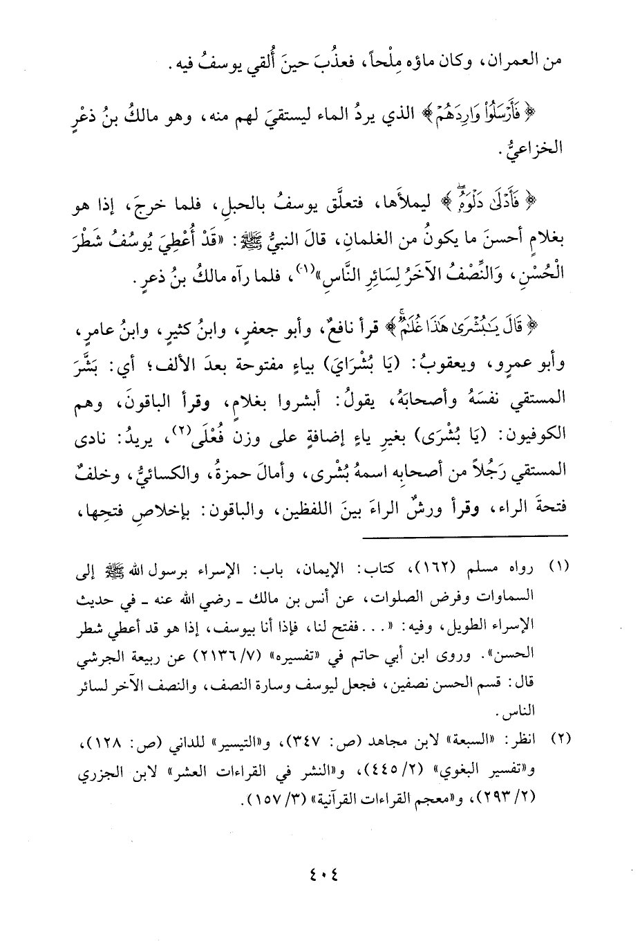 (¬1) رواه مسلم (162)، كتاب: الإيمان، باب: الإسراء برسول الله - صلى الله عليه وسلم - إلى السماوات وفرض الصلوات، عن أنس بن مالك -رضي الله عنه- في حديث الإسراء الطويل، وفيه: " ... ففتح لنا، فإذا أنا بيوسف، إذا هو قد أعطي شطر الحسن". وروى ابن أبي حاتم في "تفسيره" (7/ 2136) عن ربيعة الجرشي قال: قسم الحسن نصفين، فجعل ليوسف وسارة النصف، والنصف الآخر لسائر الناس.