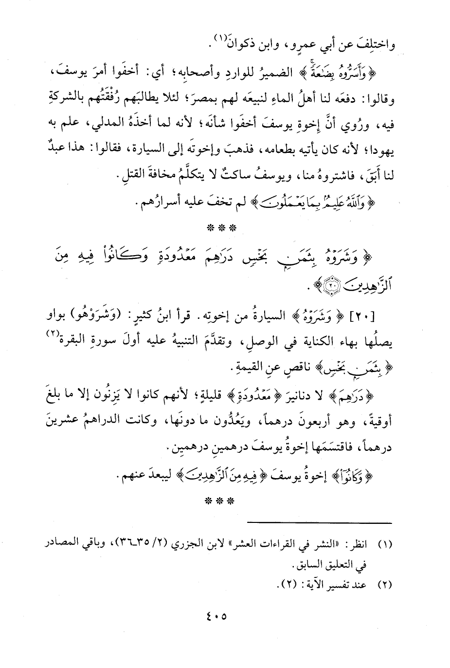 [20] {وَشَرَوْهُ} السيارةُ من إخوته. قرأ ابنُ كثيرٍ: (وَشَرَوْهُو) بواو يصلُها بهاء الكناية في الوصلِ، وتقدَّمَ التنبيهُ عليه أولَ سورةِ البقرة (¬2) {بِثَمَنٍ بَخْسٍ} ناقصٍ عنِ القيمةِ.