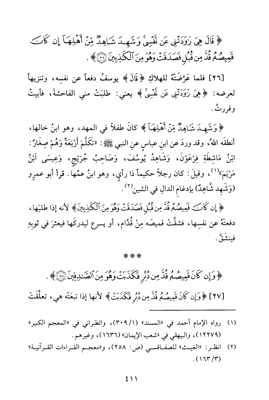 {وَشَهِدَ شَاهِدٌ مِنْ أَهْلِهَا} كانَ طفلًا في المهد، وهو ابنُ خالها، أنطقَه اللهُ، وقد وردَ عن ابنِ عباسٍ عنِ النبي - صلى الله عليه وسلم -: "تَكَلَّمَ أَرْبَعَةٌ وَهُمْ صِغَارٌ: ابْنُ مَاشِطَةِ فِرْعَوْنَ، وَشَاهِدُ يُوسُفَ، وَصَاحِبُ جُرَيْجٍ، وَعِيسَى اَبْنُ مَرْيَمَ" (¬1)، وقيلَ: كان رجلًا حكيمًا ذا رأيٍ، وهو ابنُ عمِّها. قرأ أبو عمرٍو (وَشَهِد شاهِدٌ) بإدغامِ الدالِ في الشين (¬2).