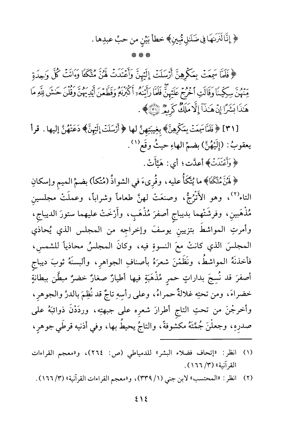[31] {فَلَمَّا سَمِعَتْ بِمَكْرِهِنَّ} بِغِيبَتِهِنَّ لها {أَرْسَلَتْ إِلَيْهِنَّ} دَعَتْهُنَّ إليها. قرأ يعقوبُ: (إِلَيْهُنَّ) بضمِّ الهاءِ حيثُ وقَع (¬1).