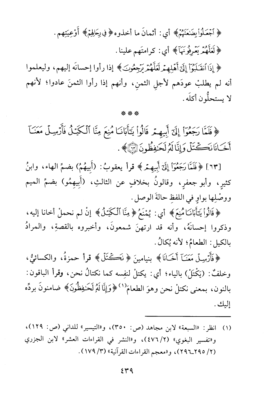 [63] {فَلَمَّا رَجَعُوا إِلَى أَبِيهِمْ} قرأ يعقوبُ: (أَبِيهُمُ) بضمِّ الهاء، وابنُ كثيرٍ، وأبو جعفرٍ، وقالونُ بخلافٍ عن الثالثِ، (أَبِيهِمُو) بضمِّ الميم ووصْلِها بواوٍ في اللفظِ حالةَ الوصل.