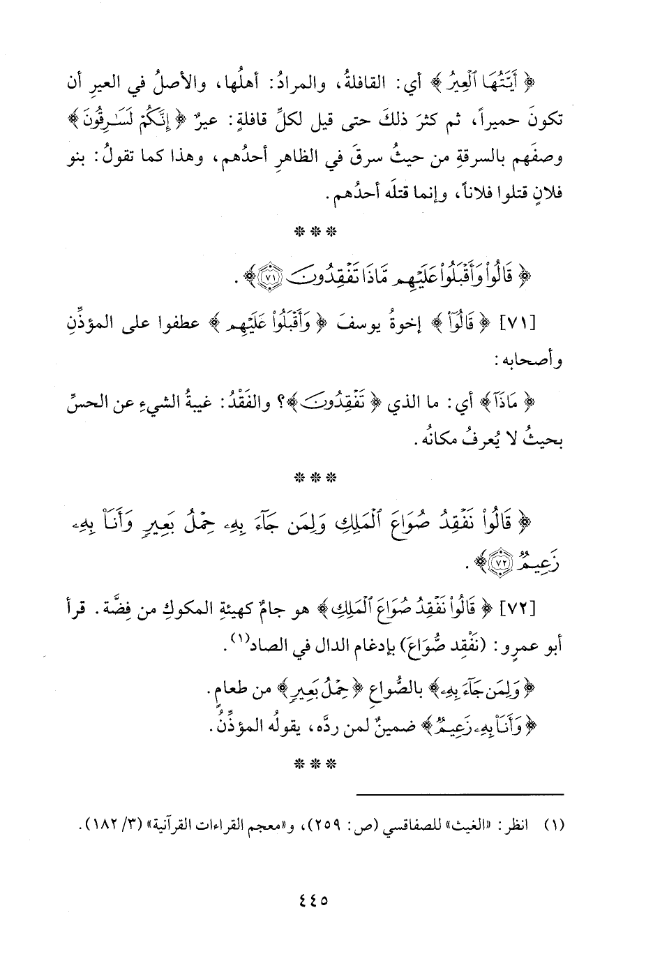 [72] {قَالُوا نَفْقِدُ صُوَاعَ الْمَلِكِ} هو جامٌ كهيئةِ المكوكِ من فِضَّة. قرأ أبو عمرٍو: {نَفْقِدُ صُوَاعَ} بإدغام الدال في الصاد (¬1).