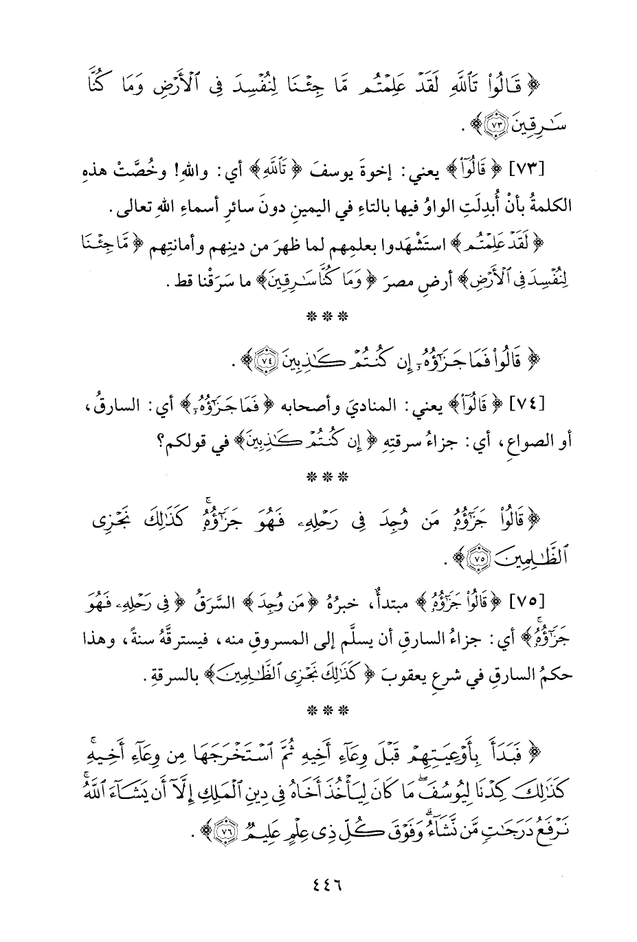 {فَبَدَأَ بِأَوْعِيَتِهِمْ قَبْلَ وِعَاءِ أَخِيهِ ثُمَّ اسْتَخْرَجَهَا مِنْ وِعَاءِ أَخِيهِ كَذَلِكَ كِدْنَا لِيُوسُفَ مَا كَانَ لِيَأْخُذَ أَخَاهُ فِي دِينِ الْمَلِكِ إِلَّا أَنْ يَشَاءَ اللَّهُ نَرْفَعُ دَرَجَاتٍ مَنْ نَشَاءُ وَفَوْقَ كُلِّ ذِي عِلْمٍ عَلِيمٌ (76)}.