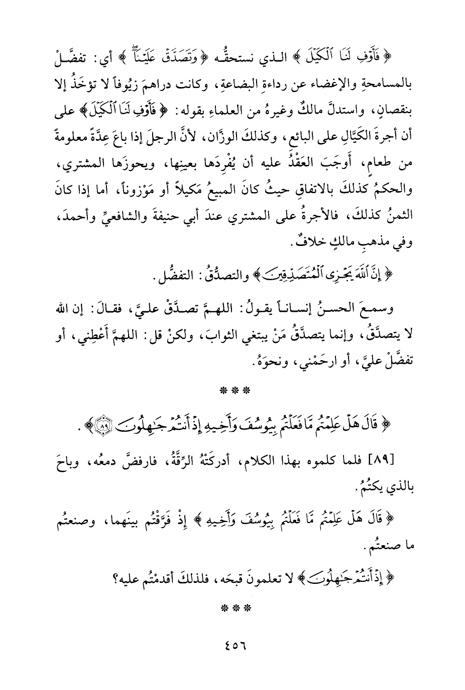{فَأَوْفِ لَنَا الْكَيْلَ} الذي نستحقُّه {وَتَصَدَّقْ عَلَيْنَا} أي: تفضَّلْ بالمسامحةِ والإغضاء عن رداءةِ البضاعةِ، وكانت دراهمَ زيُوفًا لا تؤخَذُ إلا بنقصانٍ، واستدلَّ مالكٌ وغيرهُ من العلماءِ بقوله: {فَأَوْفِ لَنَا الْكَيْلَ} على أن أجرةَ الكَيَّالِ على البائعِ، وكذلكَ الوزَّان، لأنَّ الرجلَ إذا باعَ عِدَّةً معلومةً من طعامٍ، أَوجَبَ العَقْدُ عليه أن يُفْردَها بعيِنها، ويحوزَها المشتري، والحكمُ كذلكَ بالاتفاقِ حيثُ كانَ المبيعُ مَكيلًا أو مَوْزونًا، أما إذا كانَ الثمنُ كذلكَ، فالأجرةُ على المشتري عندَ أبي حنيفةَ والشافعيِّ وأحمدَ، وفي مذهبِ مالكٍ خلافٌ.