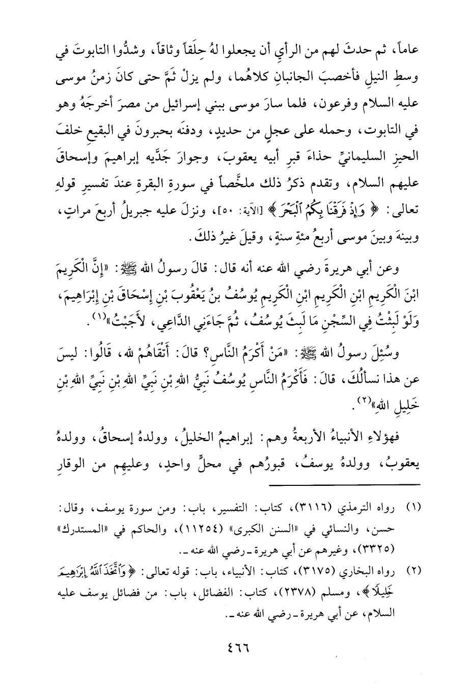 عامًا، ثم حدثَ لهم من الرأيِ أن يجعلوا لهُ حِلَقًا وثاقًا، وشدُّوا التابوتَ في وسطِ النيلِ فأخصبَ الجانبانِ كلاهُما، ولم يزلْ ثَمَّ حتى كانَ زمنُ موسى عليه السلام وفرعون، فلما سارَ موسى ببني إسرائيل من مصرَ أخرجَهُ وهو في التابوت، وحمله على عجلٍ من حديدٍ، ودفنَه بحبرونَ في البقيعِ خلفَ الحيزِ السليمانيِّ حذاءَ قبرِ أبيه يعقوبَ، وجوارَ جَدَّيه إبراهيمَ وإسحاقَ عليهم السلام، وتقدم ذكرُ ذلك ملخَّصًا في سورةِ البقرةِ عندَ تفسيرِ قولهِ تعالى: {وَإِذْ فَرَقْنَا بِكُمُ الْبَحْرَ} [الآية: 50]، ونزلَ عليه جبريلُ أربعَ مراتٍ، وبينهَ وبينَ موسى أربعُ مئةِ سنةٍ، وقيلَ غيرُ ذلكَ.
