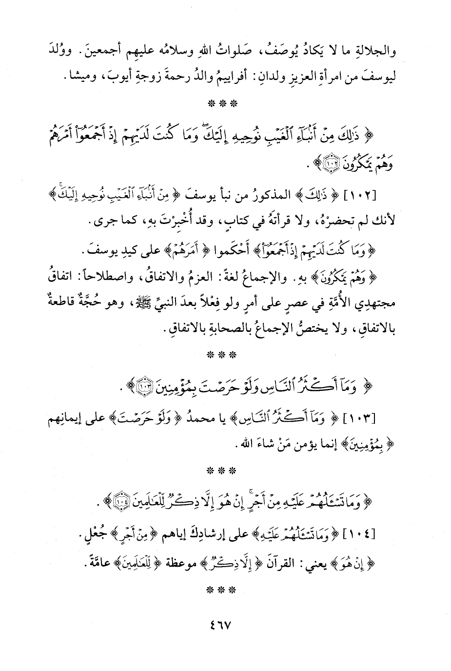 [103] {وَمَا أَكْثَرُ النَّاسِ} يا محمدُ {وَلَوْ حَرَصْتَ} على إيمانِهم {بِمُؤْمِنِينَ} إنما يؤمن مَنْ شاءَ الله.
