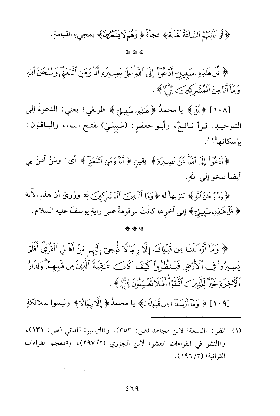 [108] {قُلْ} يا محمدُ {هَذِهِ سَبِيلِي} طريقي؛ يعني: الدعوةَ إلى التوحيدِ. قرأ نافعٌ، وأبو جعفرٍ: (سَبِيِليَ) بفتح الياء، والباقون: بإسكانها (¬1).