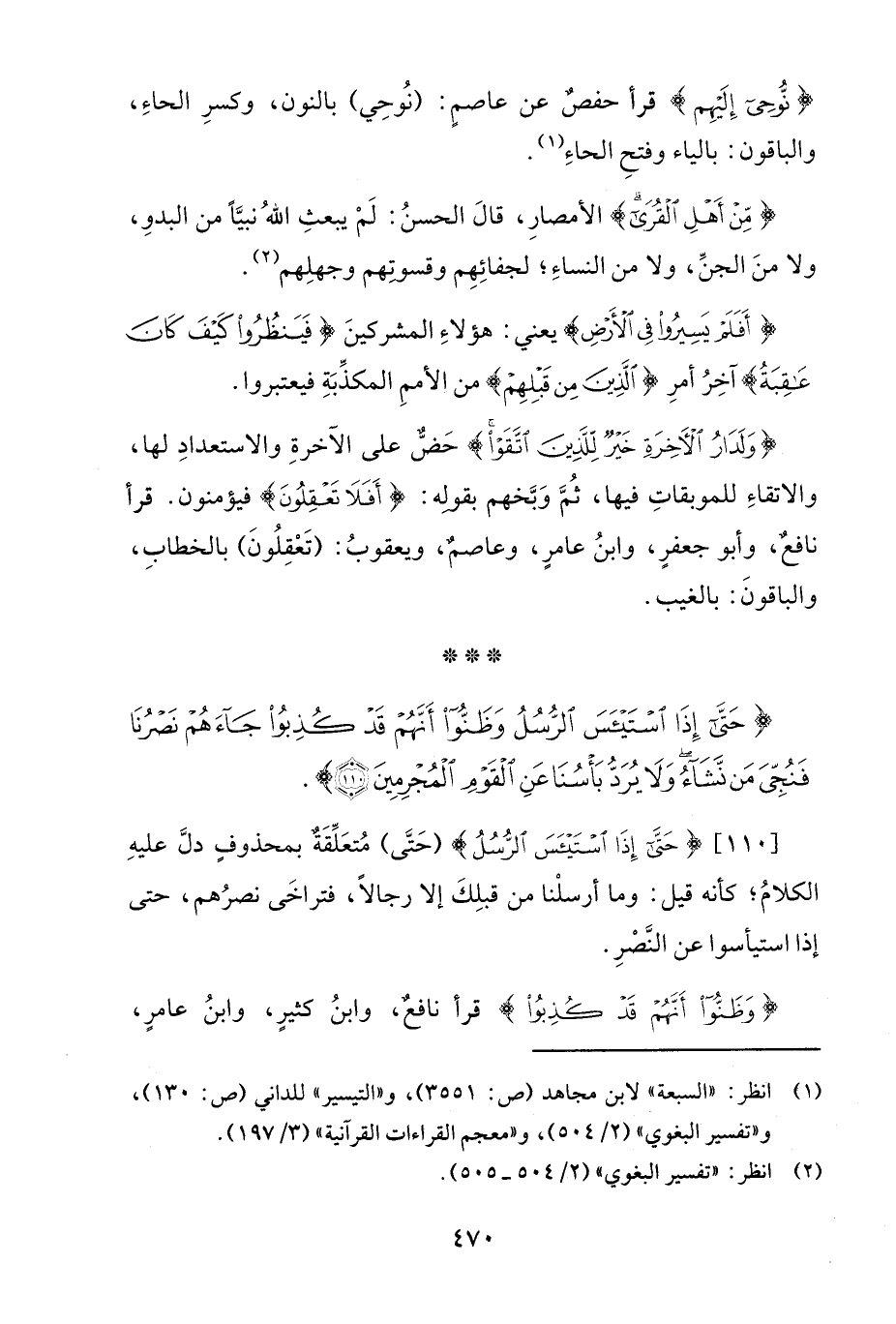 [110] {حَتَّى إِذَا اسْتَيْأَسَ الرُّسُلُ} (حَتَّى) مُتعَلِّقَةٌ بمحذوفٍ دلَّ عليهِ الكلامُ؛ كأنه قيل: وما أرسلْنا من قبلِكَ إلا رجالًا، فتراخَى نصرُهم، حتى إذا استيأسوا عن النَّصْرِ.