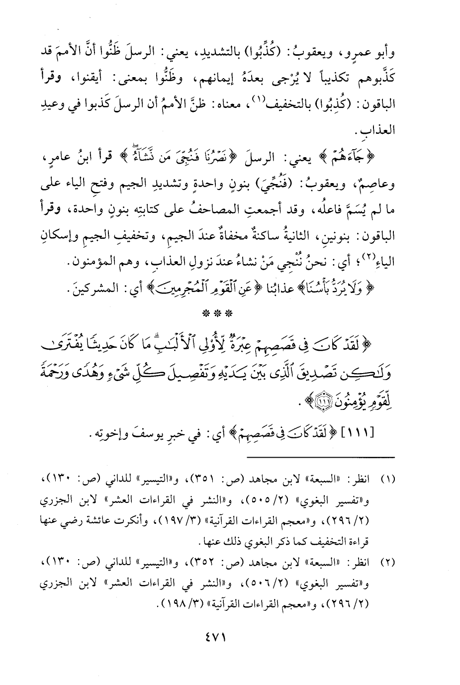(¬1) انظر: "السبعة" لابن مجاهد (ص: 351)، و"التيسير" للداني (ص: 130)، و"تفسير البغوي" (2/ 505)، و"النشر في القراءات العشر" لابن الجزري (2/ 296)، و"معجم القراءات القرآنية" (3/ 197)، وأنكرت عائشة رضي عنها قراءة التخفيف كما ذكر البغوي ذلك عنها.