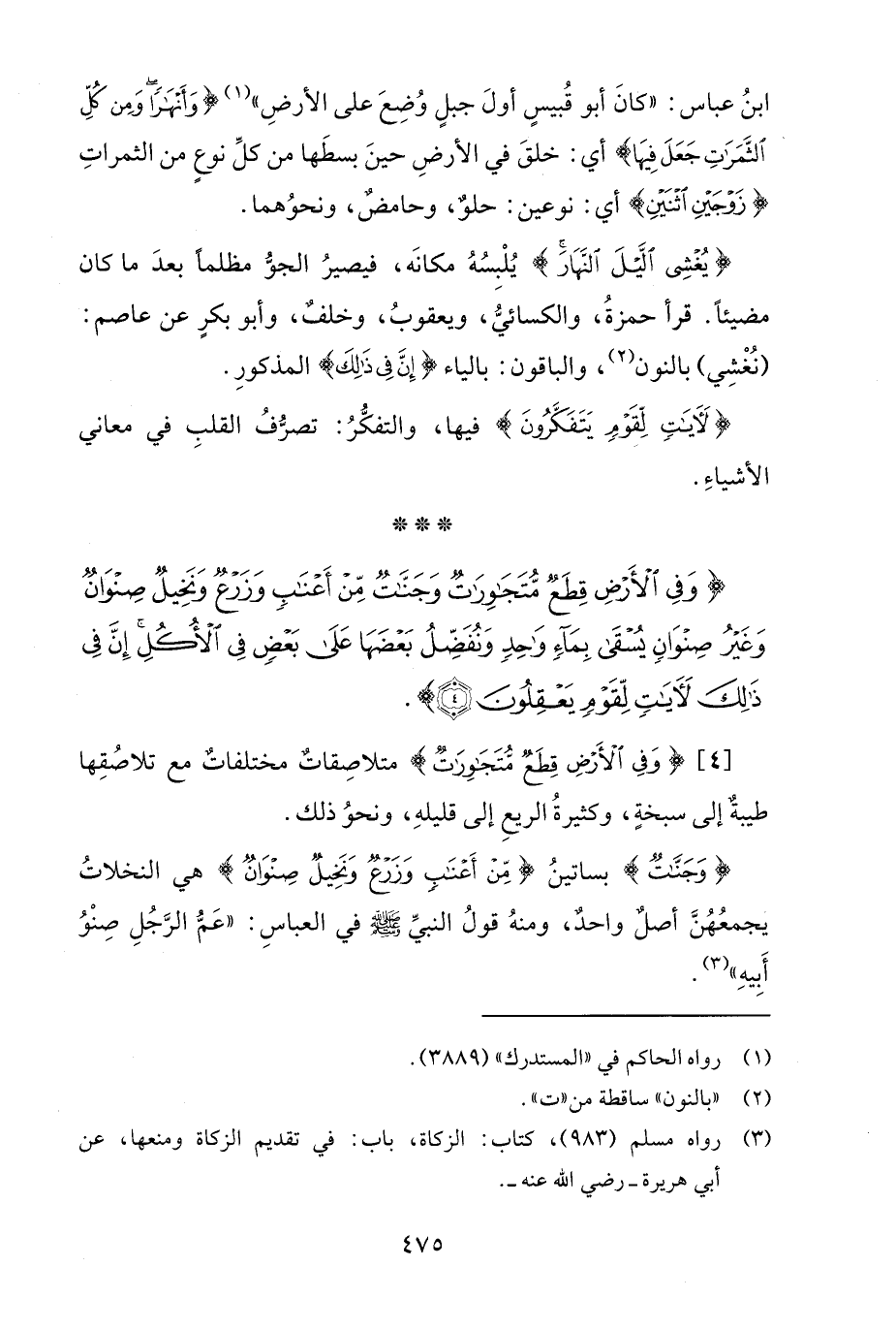 {وَجَنَّاتٌ} بساتينُ {مِنْ أَعْنَابٍ وَزَرْعٌ وَنَخِيلٌ صِنْوَانٌ} هي النخلاتُ يجمعُهُنَّ أصلٌ واحدٌ، ومنهُ قولُ النبيِّ - صلى الله عليه وسلم - في العباسِ: "عَمُّ الرَّجُلِ صِنْوُ أَبِيهِ" (¬3).