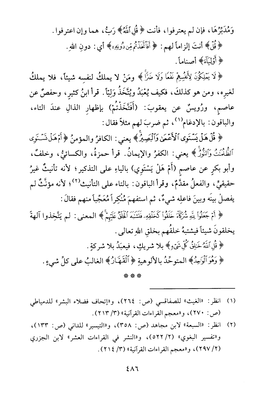 {لَا يَمْلِكُونَ لِأَنْفُسِهِمْ نَفْعًا وَلَا ضَرًّا} ومَنْ لا يملكُ لنفسِه شيئًا، فلا يملكُ لغيرِه، ومن هو كذلكَ، فكيف يُعْبَدُ ويُتَّخَذُ وَلِيًّا. قرأ ابنُ كثيرٍ، وحفصٌ عن عاصمٍ، ورُويسٌ عن يعقوبَ: (أَفَتَّخَذْتُمْ) بإظهارِ الذالِ عندَ التاء، والباقون: بالإدغام (¬1)، ثم ضربَ لهم مثلًا فقال: