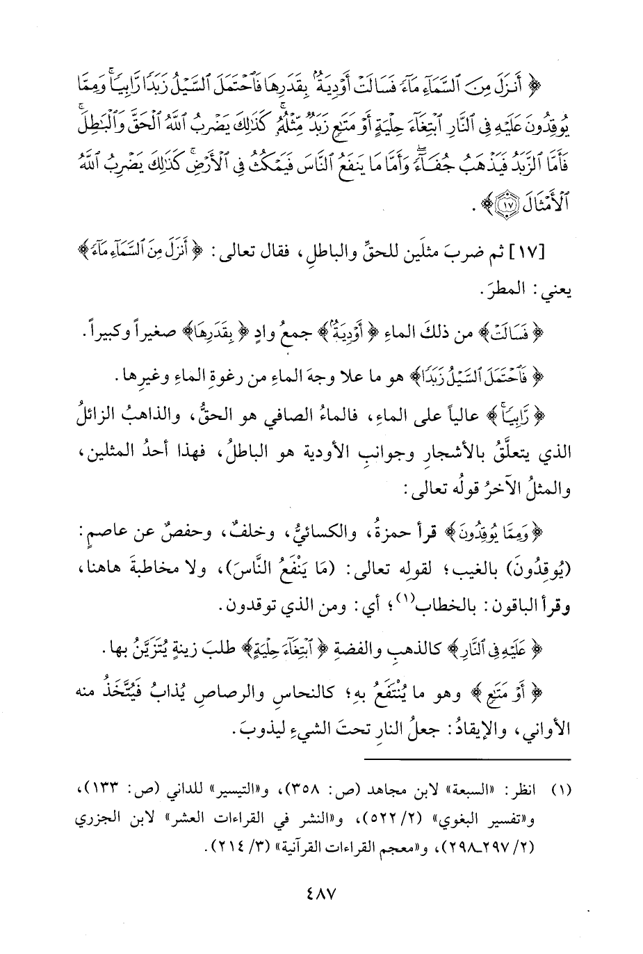 [17] ثم ضربَ مثلَين للحقِّ والباطلِ، فقال تعالى: {أَنْزَلَ مِنَ السَّمَاءِ مَاءً} يعني: المطرَ.