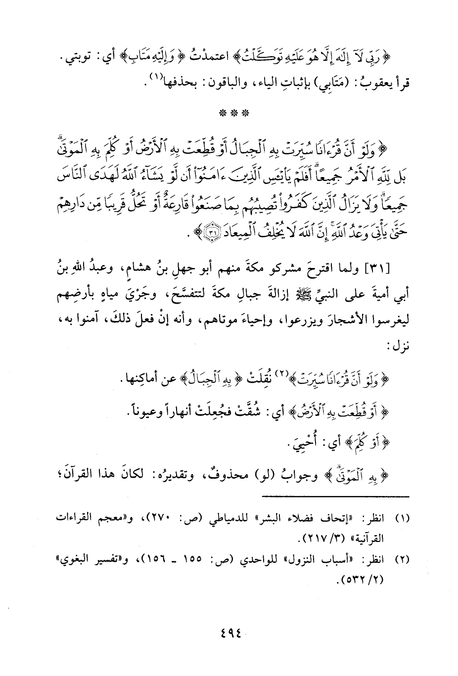 {وَلَوْ أَنَّ قُرْآنًا سُيِّرَتْ بِهِ الْجِبَالُ أَوْ قُطِّعَتْ بِهِ الْأَرْضُ أَوْ كُلِّمَ بِهِ الْمَوْتَى بَلْ لِلَّهِ الْأَمْرُ جَمِيعًا أَفَلَمْ يَيْأَسِ الَّذِينَ آمَنُوا أَنْ لَوْ يَشَاءُ اللَّهُ لَهَدَى النَّاسَ جَمِيعًا وَلَا يَزَالُ الَّذِينَ كَفَرُوا تُصِيبُهُمْ بِمَا صَنَعُوا قَارِعَةٌ أَوْ تَحُلُّ قَرِيبًا مِنْ دَارِهِمْ حَتَّى يَأْتِيَ وَعْدُ اللَّهِ إِنَّ اللَّهَ لَا يُخْلِفُ الْمِيعَادَ (31)}.
