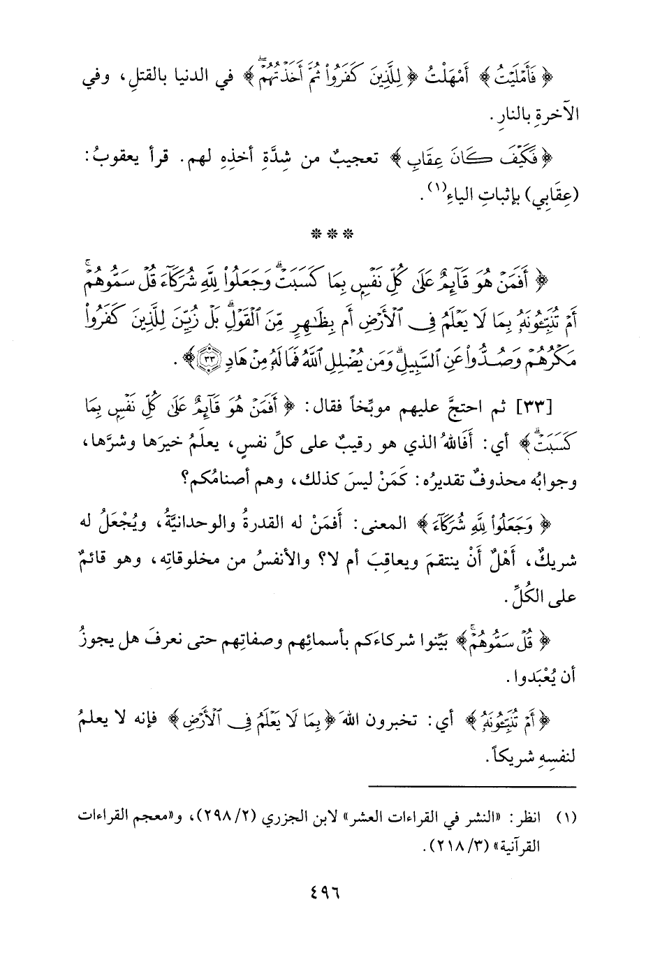 {أَفَمَنْ هُوَ قَائِمٌ عَلَى كُلِّ نَفْسٍ بِمَا كَسَبَتْ وَجَعَلُوا لِلَّهِ شُرَكَاءَ قُلْ سَمُّوهُمْ أَمْ تُنَبِّئُونَهُ بِمَا لَا يَعْلَمُ فِي الْأَرْضِ أَمْ بِظَاهِرٍ مِنَ الْقَوْلِ بَلْ زُيِّنَ لِلَّذِينَ كَفَرُوا مَكْرُهُمْ وَصُدُّوا عَنِ السَّبِيلِ وَمَنْ يُضْلِلِ اللَّهُ فَمَا لَهُ مِنْ هَادٍ (33)}.