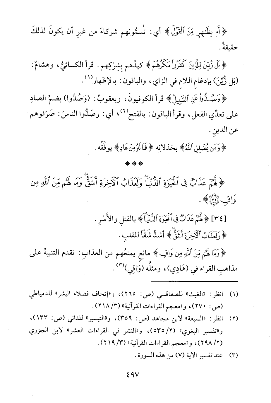 {بَلْ زُيِّنَ لِلَّذِينَ كَفَرُوا مَكْرُهُمْ} كيدُهم بِشِرْكِهم. قرأ الكسائيُّ، وهشامٌ: (بَل زُيِّنَ) بإدغامِ اللامِ في الزاي، والباقون: بالإظهار (¬1).