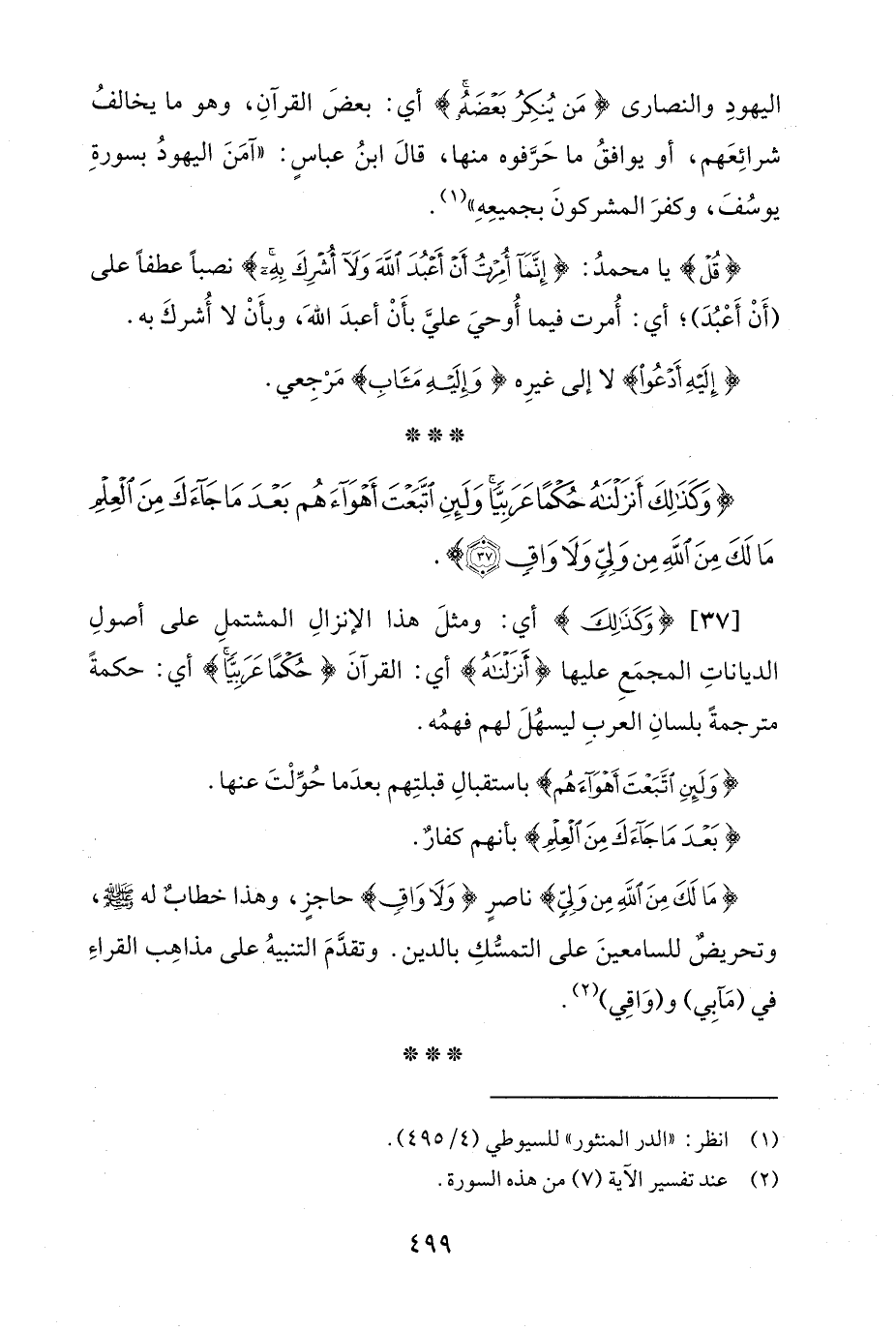 {وَكَذَلِكَ أَنْزَلْنَاهُ حُكْمًا عَرَبِيًّا وَلَئِنِ اتَّبَعْتَ أَهْوَاءَهُمْ بَعْدَ مَا جَاءَكَ مِنَ الْعِلْمِ مَا لَكَ مِنَ اللَّهِ مِنْ وَلِيٍّ وَلَا وَاقٍ (37)}.