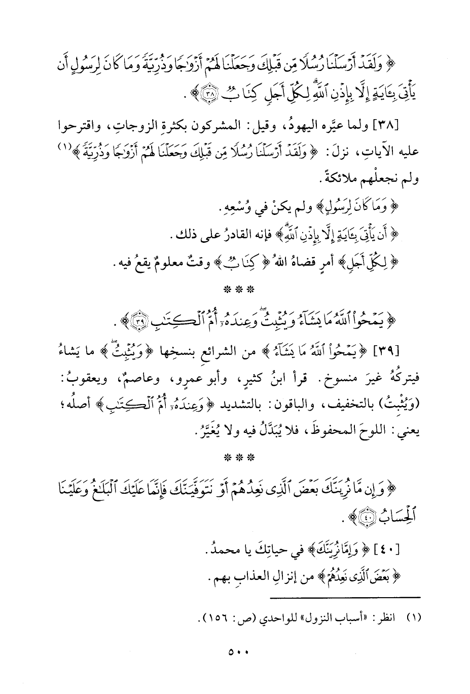 [39] {يَمْحُو اللَّهُ مَا يَشَاءُ} من الشرائعِ بنسخِها {وَيُثْبِتُ} ما يَشاءُ فيتركُهُ غيرَ منسوخ. قرأ ابنُ كثيرٍ، وأبو عمرٍو، وعاصم، ويعقوبُ: (وَيُثْبِتُ) بالتخفيف، والباقون: بالتشديد {وَعِنْدَهُ أُمُّ الْكِتَابِ} أصلُه؛ يعني: اللوحَ المحفوظَ، فلا يُبَدَّلُ فيه ولا يُغَيَّرُ.