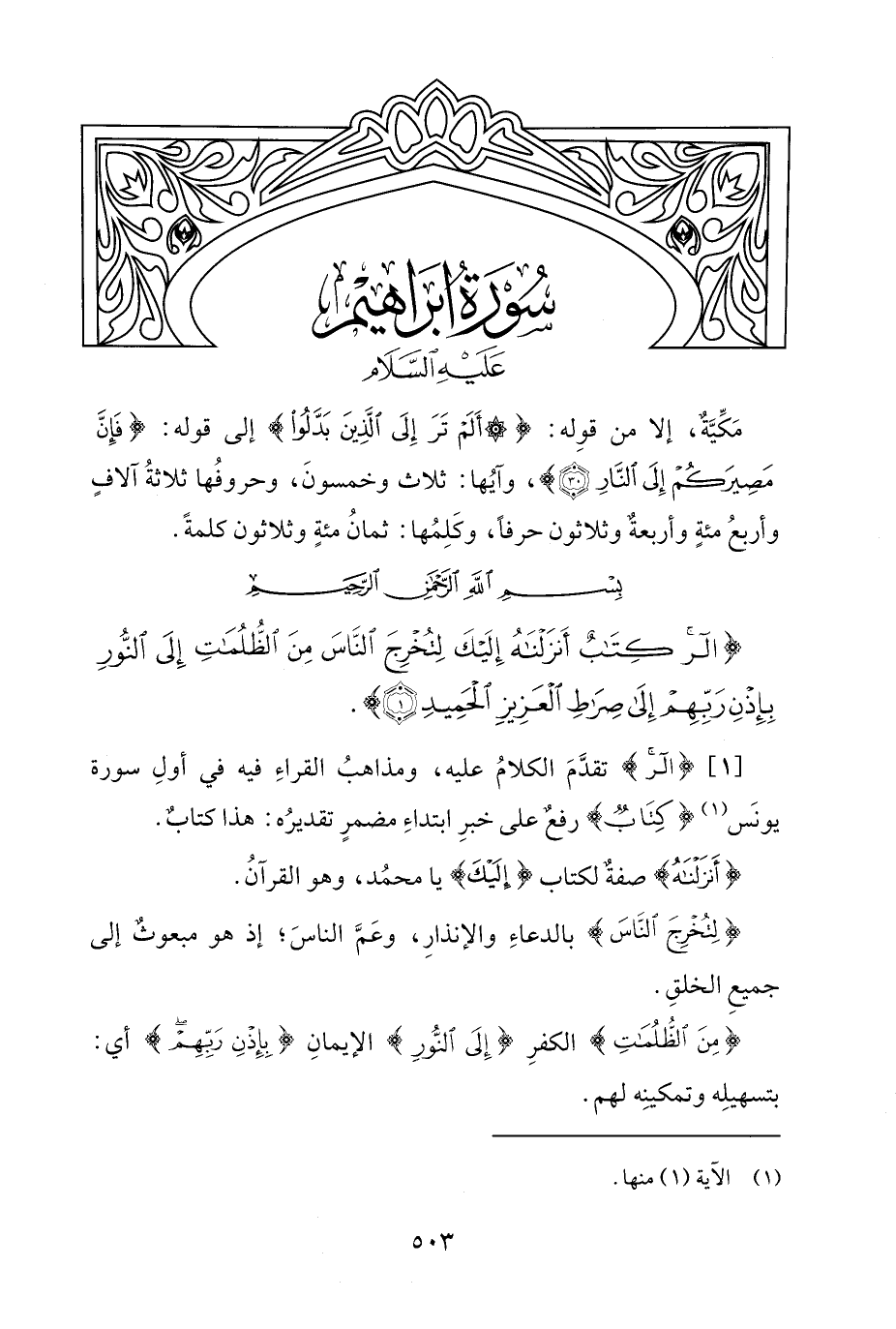 {الر كِتَابٌ أَنْزَلْنَاهُ إِلَيْكَ لِتُخْرِجَ النَّاسَ مِنَ الظُّلُمَاتِ إِلَى النُّورِ بِإِذْنِ رَبِّهِمْ إِلَى صِرَاطِ الْعَزِيزِ الْحَمِيدِ (1)}.
