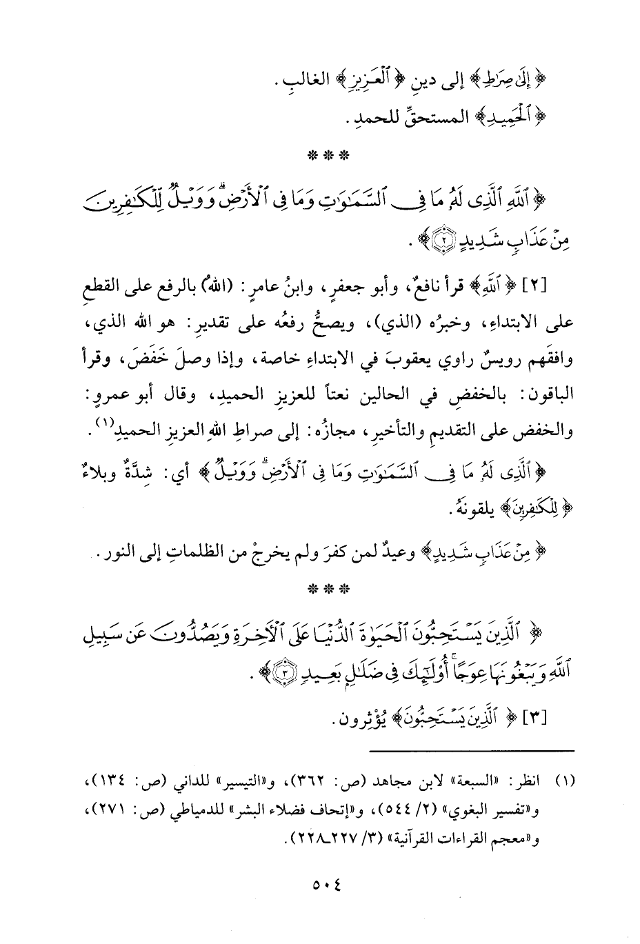 [2] {اللَّهِ} قرأ نافعٌ، وأبو جعفرٍ، وابنُ عامرٍ: (الله) بالرفع على القطعِ على الابتداءِ، وخبرُه (الذي)، ويصحُّ رفعُه على تقديرِ: هو الله الذي، وافقَهم رويسٌ راوي يعقوبَ في الابتداءِ خاصة، وإذا وصلَ خَفَضَ، وقرأ الباقون: بالخفضِ في الحالين نعتًا للعزيزِ الحميدِ، وقال أبو عمروٍ: والخفض على التقديمِ والتأخيرِ، مجازُه: إلى صراطِ اللهِ العزيزِ الحميدِ (¬1).