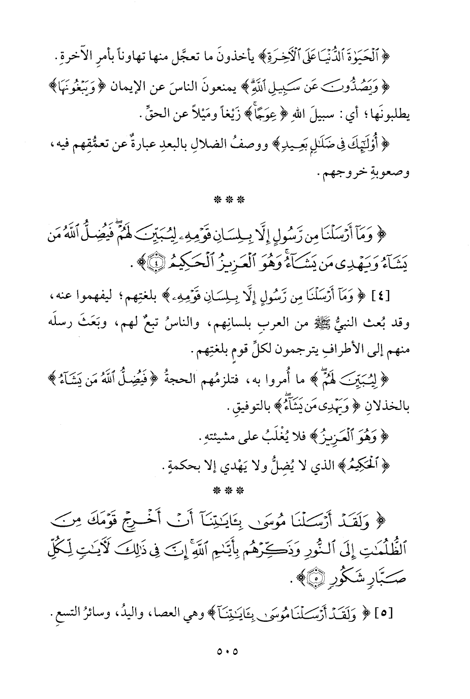 {وَمَا أَرْسَلْنَا مِنْ رَسُولٍ إِلَّا بِلِسَانِ قَوْمِهِ لِيُبَيِّنَ لَهُمْ فَيُضِلُّ اللَّهُ مَنْ يَشَاءُ وَيَهْدِي مَنْ يَشَاءُ وَهُوَ الْعَزِيزُ الْحَكِيمُ (4)}.