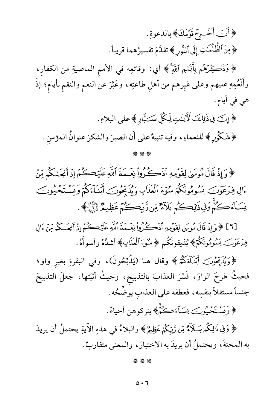{وَإِذْ قَالَ مُوسَى لِقَوْمِهِ اذْكُرُوا نِعْمَةَ اللَّهِ عَلَيْكُمْ إِذْ أَنْجَاكُمْ مِنْ آلِ فِرْعَوْنَ يَسُومُونَكُمْ سُوءَ الْعَذَابِ وَيُذَبِّحُونَ أَبْنَاءَكُمْ وَيَسْتَحْيُونَ نِسَاءَكُمْ وَفِي ذَلِكُمْ بَلَاءٌ مِنْ رَبِّكُمْ عَظِيمٌ (6)}.