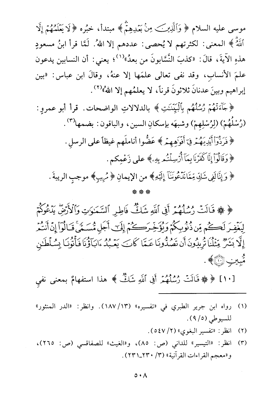 [10] {قَالَتْ رُسُلُهُمْ أَفِي اللَّهِ شَكٌّ} هذا استفهامٌ بمعنى نفيِ