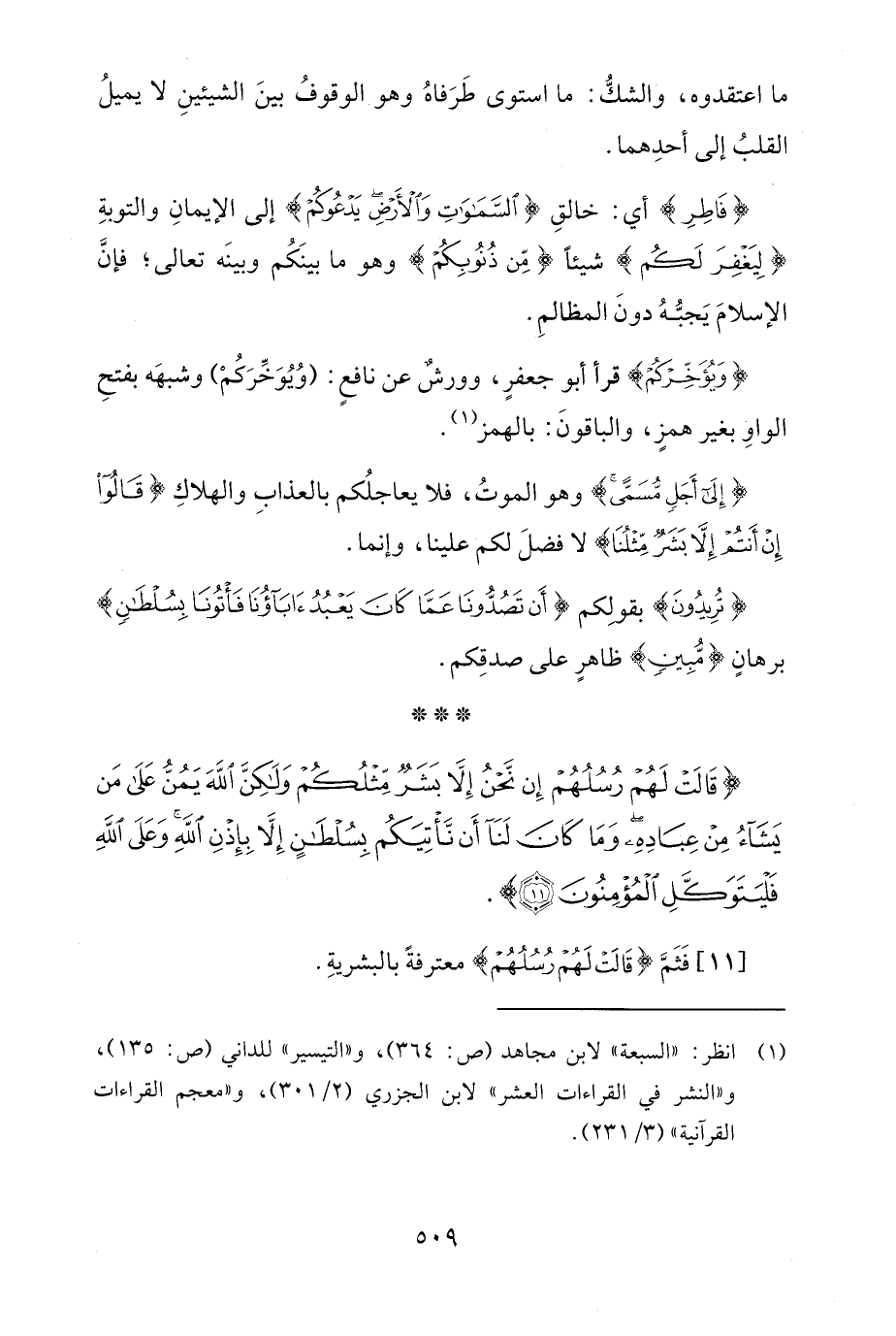{وَيُؤَخِّرَكُمْ} قرأ أبو جعفرٍ، وورشٌ عن نافعٍ: (ويُوَخِّرَكُمْ) وشبهَه بفتحِ الواوِ بغير همزٍ، والباقونَ: بالهمز (¬1).