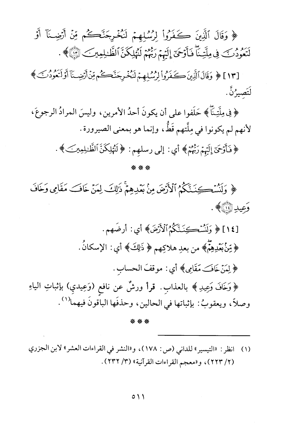 [13] {وَقَالَ الَّذِينَ كَفَرُوا لِرُسُلِهِمْ لَنُخْرِجَنَّكُمْ مِنْ أَرْضِنَا أَوْ لَتَعُودُنَّ} لَتَصِيرُنَّ.