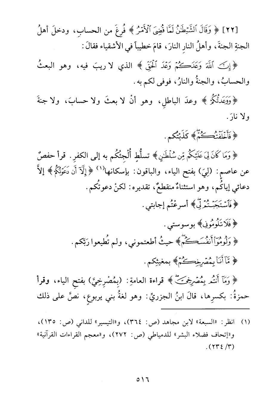 {وَمَا أَنْتُمْ بِمُصْرِخِيَّ} قراءة العامةِ: (بِمُصْرِخِيَّ) بفتحِ الياء، وقرأ حمزةُ: بكسرِها، قالَ ابنُ الجزريِّ: وهو لغةُ بني يربوعٍ، نصَّ على ذلك