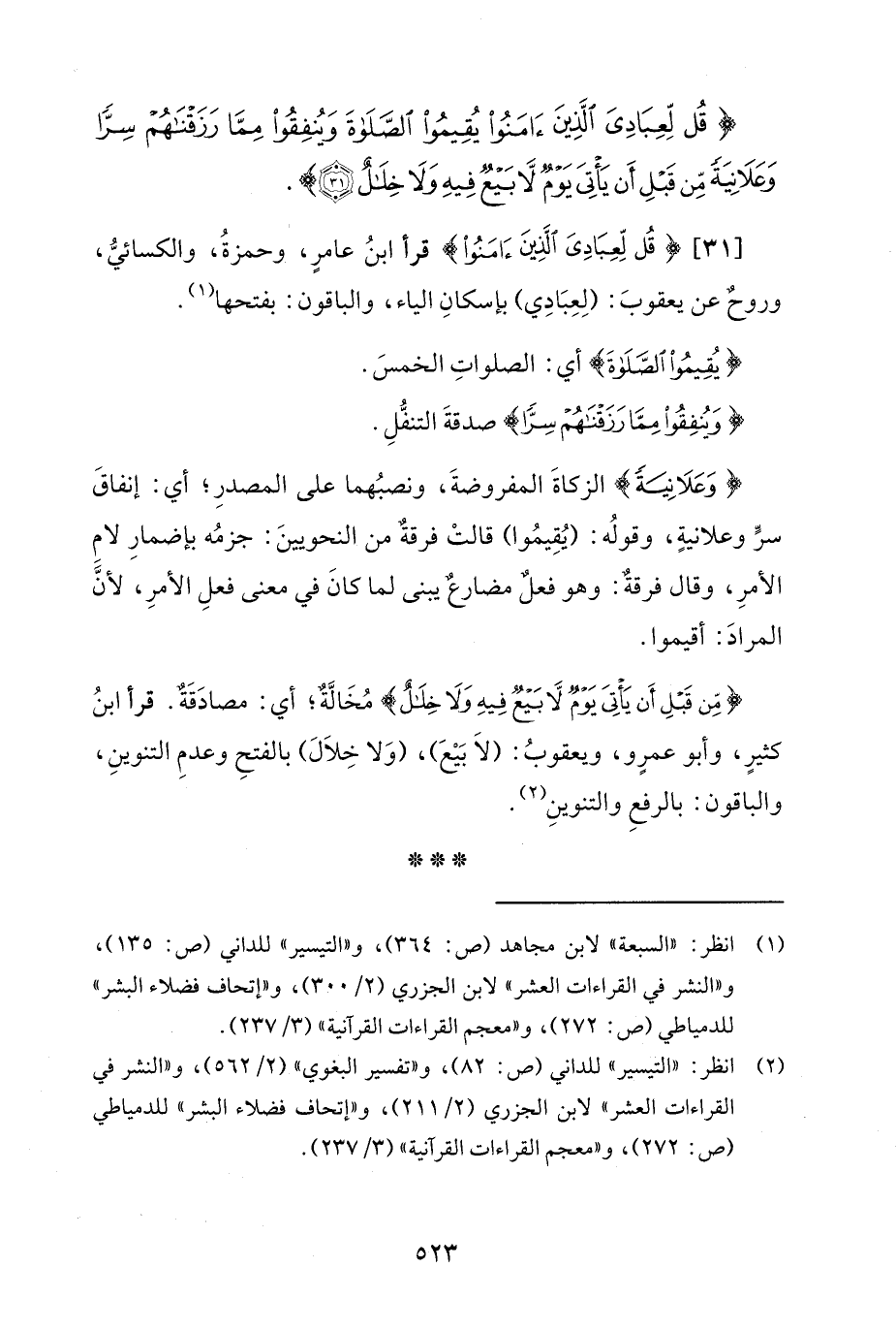 [31] {قُلْ لِعِبَادِيَ الَّذِينَ آمَنُوا} قرأ ابنُ عامرٍ، وحمزةُ، والكسائيُّ، وروحٌ عن يعقوبَ: (لِعِبَادِي) بإسكانِ الياء، والباقون: بفتحها (¬1).