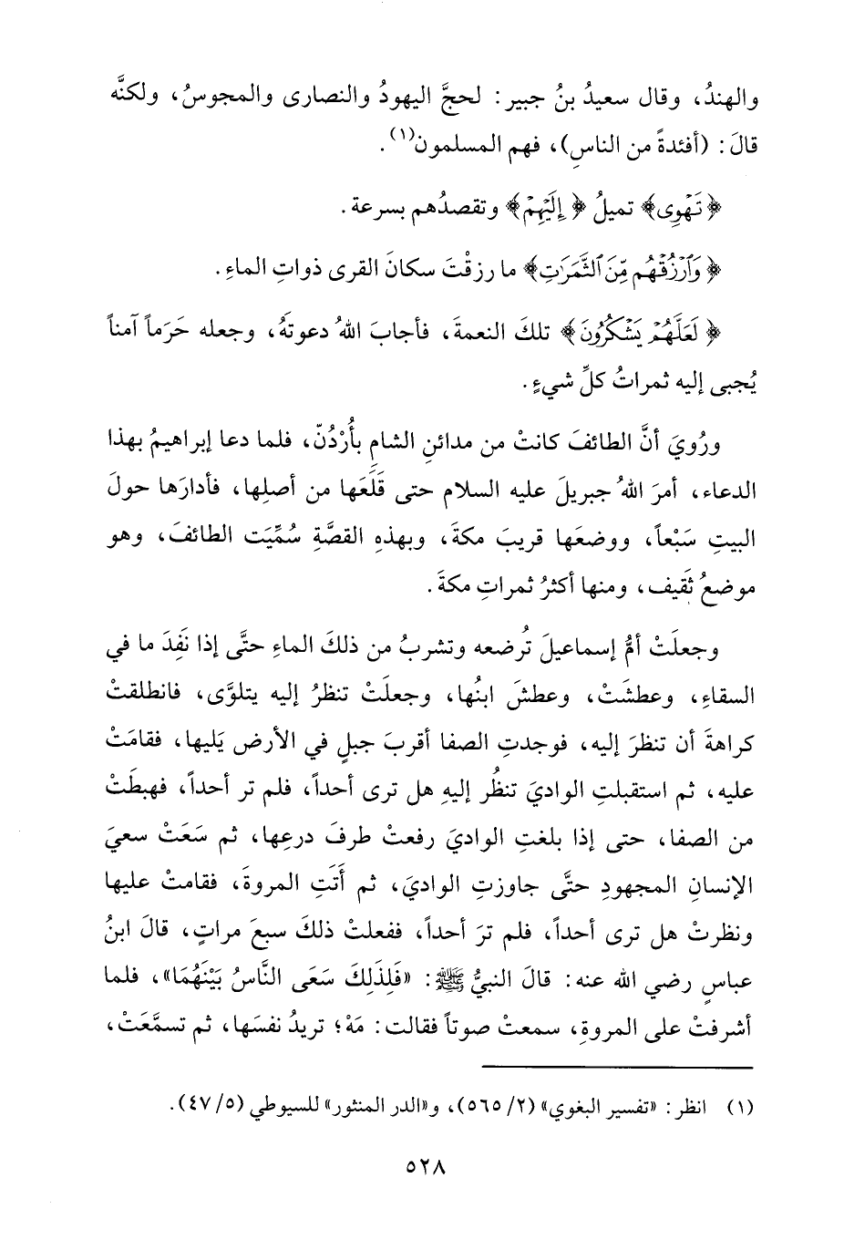 ورُويَ أنَّ الطائفَ كانتْ من مدائنِ الشامِ بأُرْدُنّ، فلما دعا إبراهيمُ بهذا الدعاء، أمرَ اللهُ جبريلَ عليه السلام حتى قَلَعَها من أصلِها، فأدارَها حولَ البيتِ سَبْعًا، ووضعَها قريبَ مكةَ، وبهذهِ القصَّةِ سُمِّيَت الطائفَ، وهو موضعُ ثَقيف، ومنها أكثرُ ثمراتِ مكةَ.
