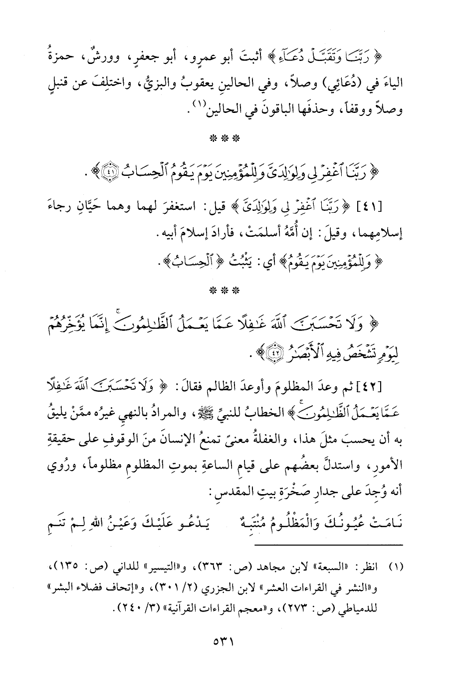 [41] {رَبَّنَا اغْفِرْ لِي وَلِوَالِدَيَّ} قيل: استغفرَ لهما وهما حَيَّانِ رجاءَ إسلامِهما، وقيلَ: إن أُمَّهُ أسلمَتْ، فأرادَ إسلامَ أبيه.