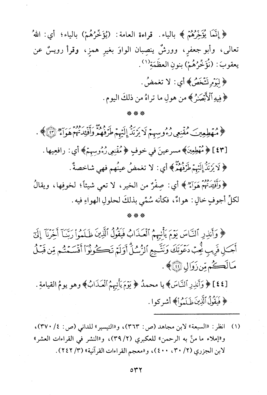 {إِنَّمَا يُؤَخِّرُهُمْ} بالياء. قراءة العامة: (يُؤَخِّرُهُمْ) بالياء؛ أي: اللهُ تعالى، وأبو جعفرٍ، وورشٌ ينصبان الواوَ بغيرِ همزٍ، وقرأ رويسٌ عن يعقوبَ: (نُؤَخِّرُهُمْ) بنونِ العظَمَةِ (¬1).