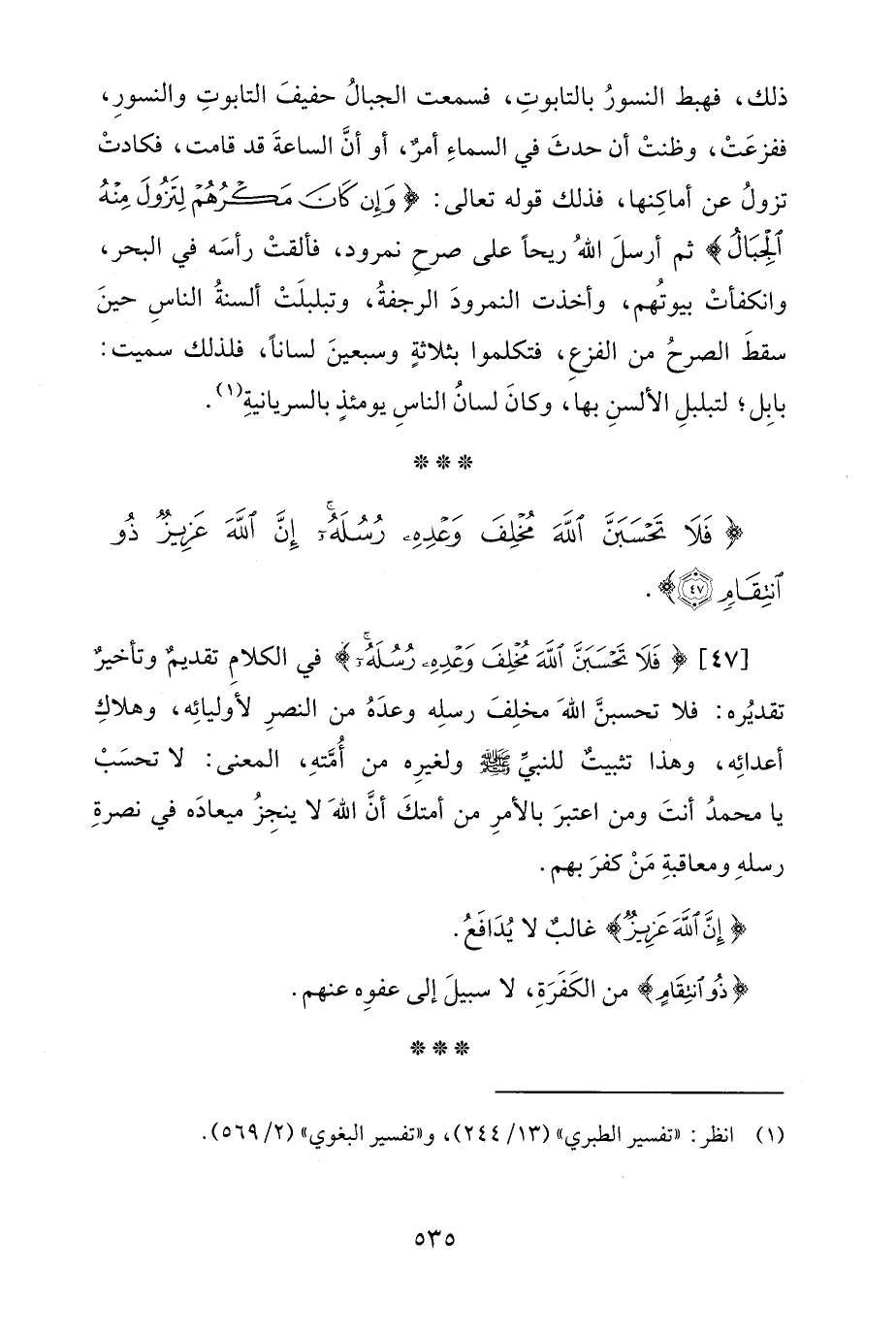 [47] {فَلَا تَحْسَبَنَّ اللَّهَ مُخْلِفَ وَعْدِهِ رُسُلَهُ} في الكلامِ تقديمٌ وتأخيرٌ تقديُره: فلا تحسبنَّ اللهَ مخلِفَ رسلِه وعدَهُ من النصرِ لأوليائِه، وهلاكِ أعدائِه، وهذا تثبيتٌ للنبيِّ - صلى الله عليه وسلم - ولغيرِه من أُمَّتهِ، المعنى: لا تحسَبْ يا محمدُ أنتَ ومن اعتبرَ بالأمرِ من أمتكَ أنَّ اللهَ لا ينجِزُ ميعادَه في نصرةِ رسلهِ ومعاقبةِ مَنْ كفرَ بهم.
