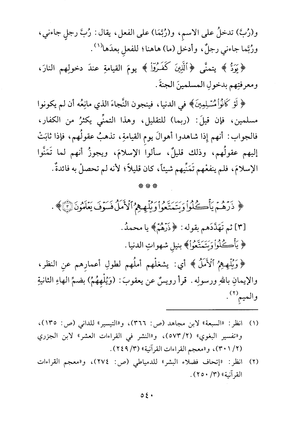 {ذَرْهُمْ يَأْكُلُوا وَيَتَمَتَّعُوا وَيُلْهِهِمُ الْأَمَلُ فَسَوْفَ يَعْلَمُونَ (3)}.