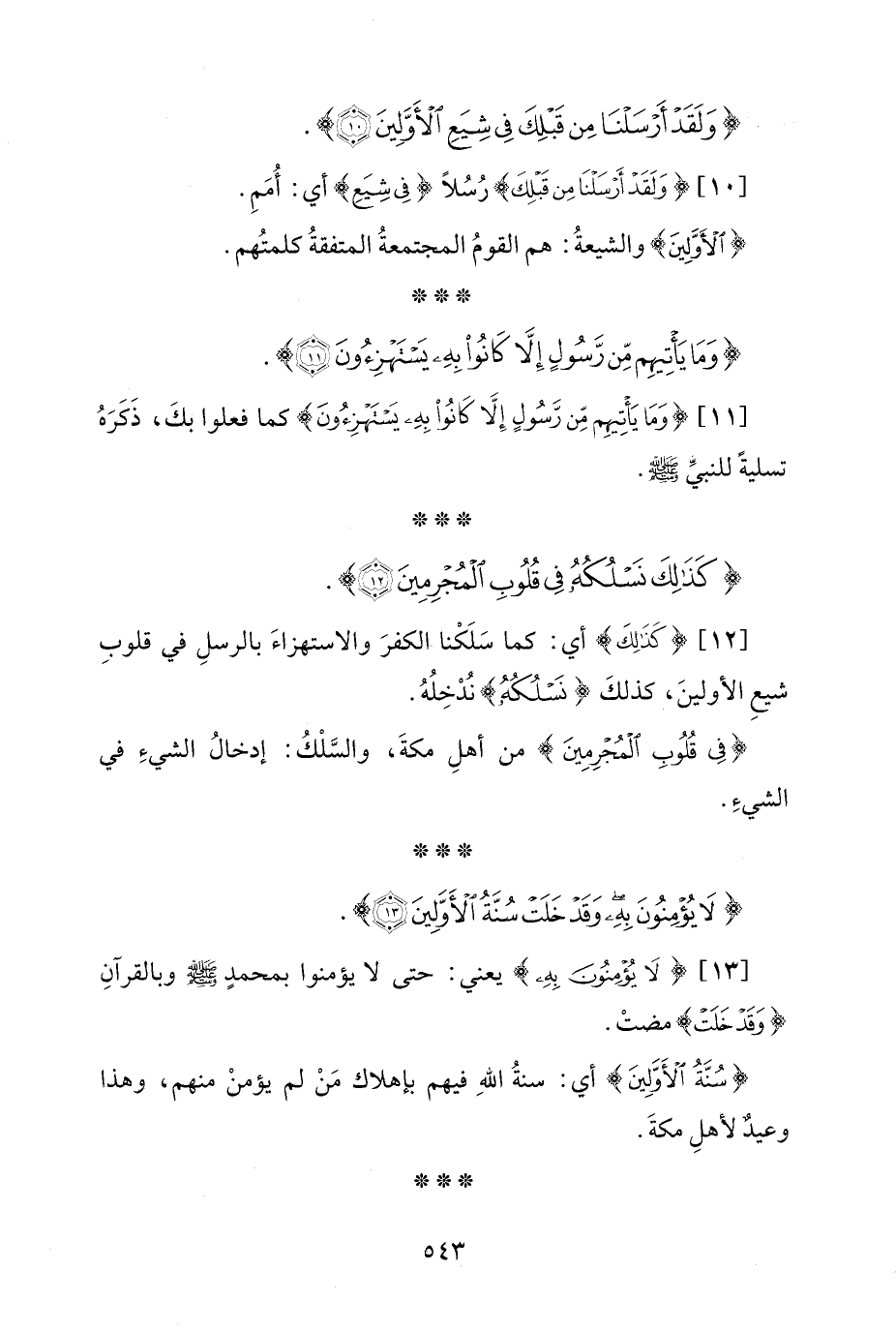 [12] {كَذَلِكَ} أي: كما سَلَكْنا الكفرَ والاستهزاءَ بالرسلِ في قلوبِ شيعِ الأولينَ، كذلكَ {نَسْلُكُهُ} نُدْخِلُهُ.